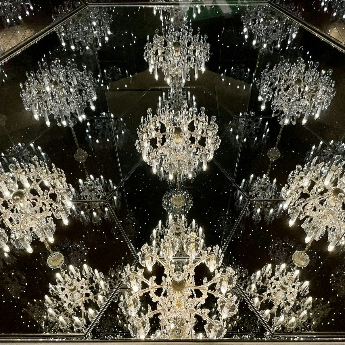 暗い部屋の中央でゆっくりと回転するシャンデリア。展示室を囲む鏡張りの壁には無数のシャンデリアが映り込み、ほのかな光が空間に無限に広がる。