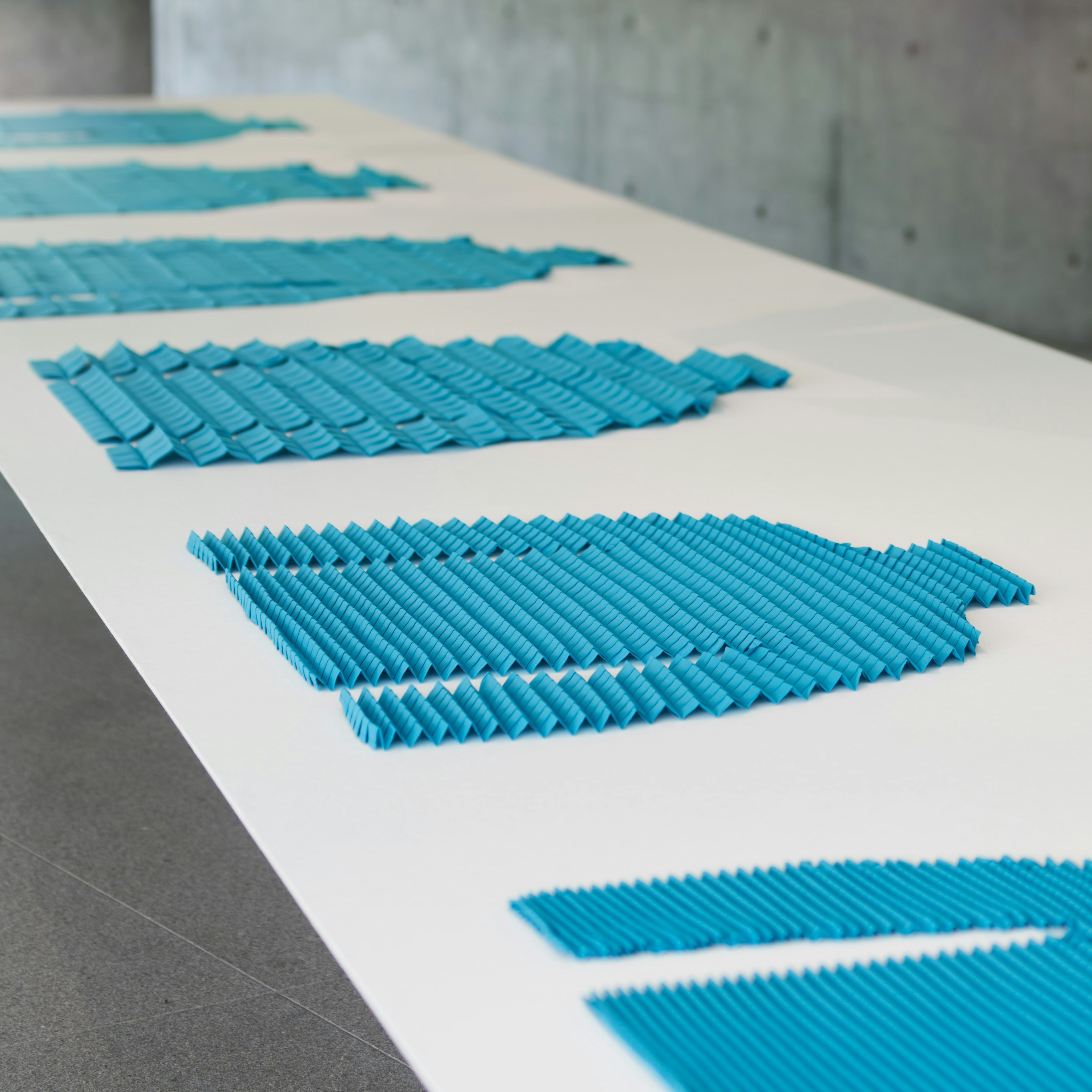「実際に触れてみると、ポヨンポヨンと柔らかく軽い感じがするので、どのような構造でその質感が生まれているのかに着目しました。縦と横にプリーツがかけられているその構造を知りたくて、実際に加工の過程を見せていただきました。生地を紙のような素材で挟み、まず縦方向に1回、次に横方向に1回プリーツをかけます。その深さが異なり、縦方向にはかなり深く折り込んであり、横方向は緩やかな山なりです。そうして縦と横にプリーツをかけて生まれる構造はグリッド状になっているので、そのグリッドをひとつの単位として取り出そうと考えました」。