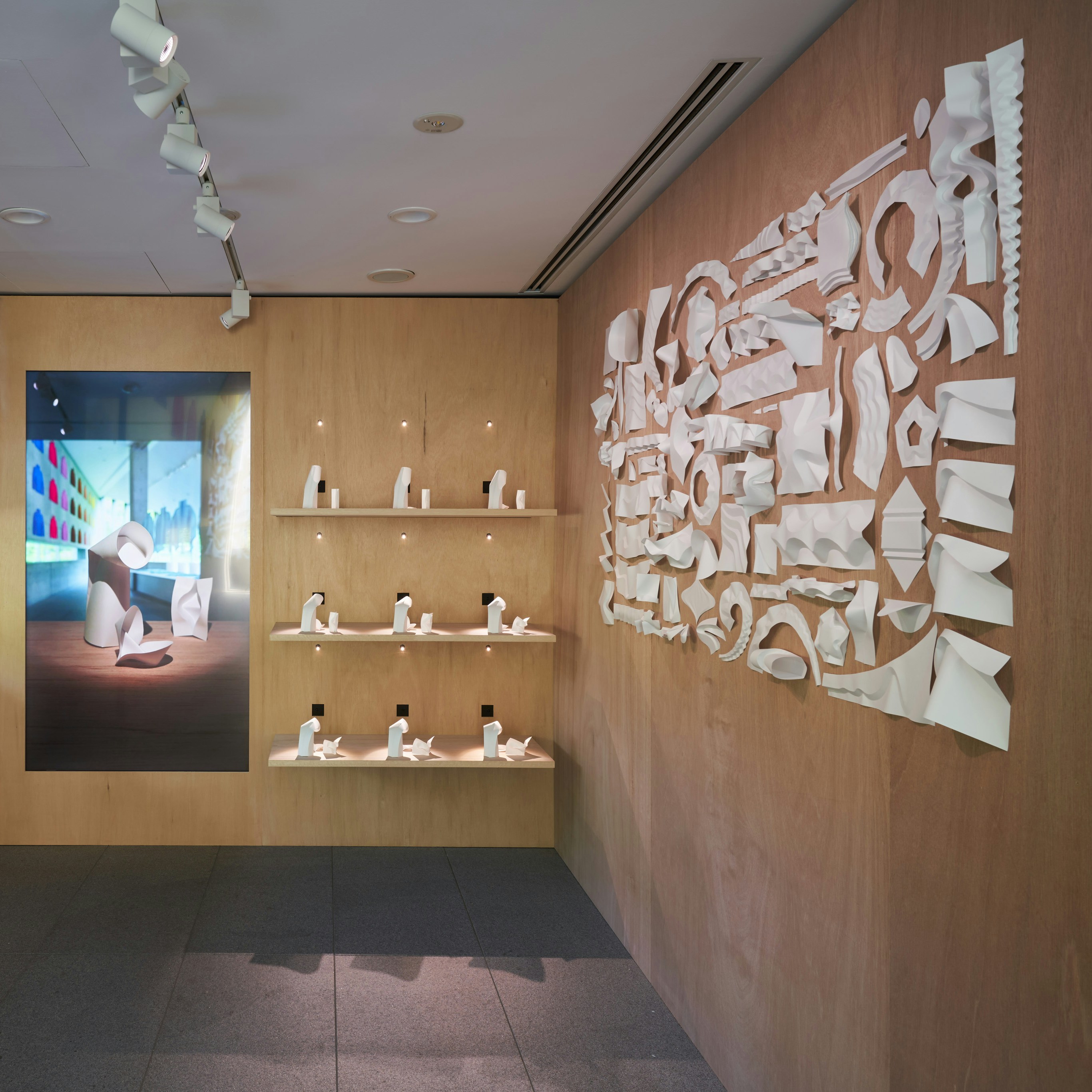 そして展示室奥のスペースでは、縦と横のプリーツ構造の組み合わせから生まれる、形や動きのバリエーションを提示するコンテンツとなっている。