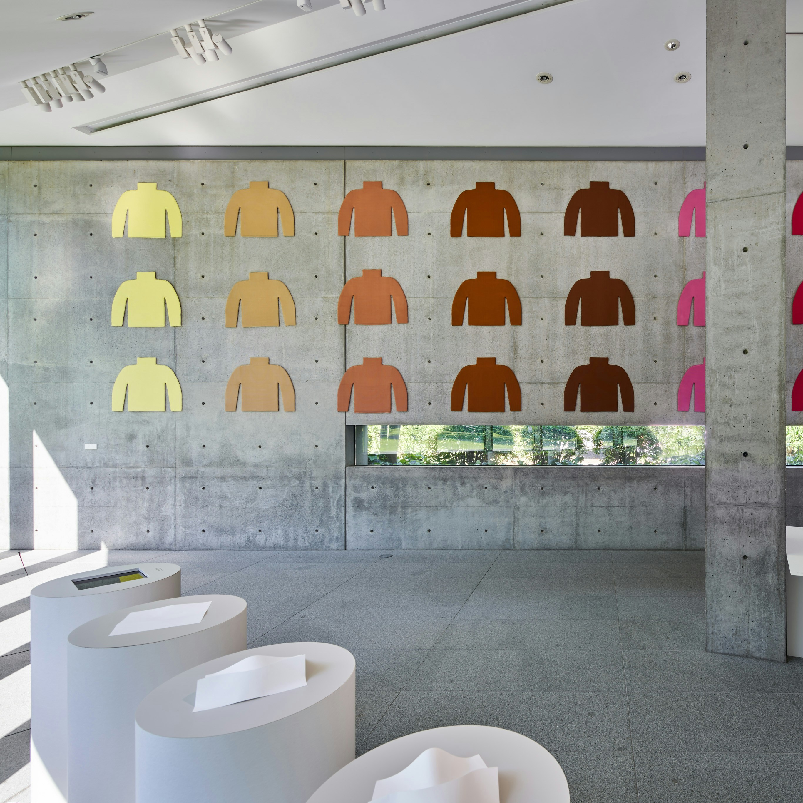 ブランドが展示ディレクターとして声をかけたのは、グラフィックデザイナーの岡崎智弘だ。「縦と横にプリーツを加えたSTRETCH PLEATSという素材の、加工方法をどう展示し、鑑賞者に体験していただくか」という、とてもシンプルなお題を提示されたと岡崎は話す。