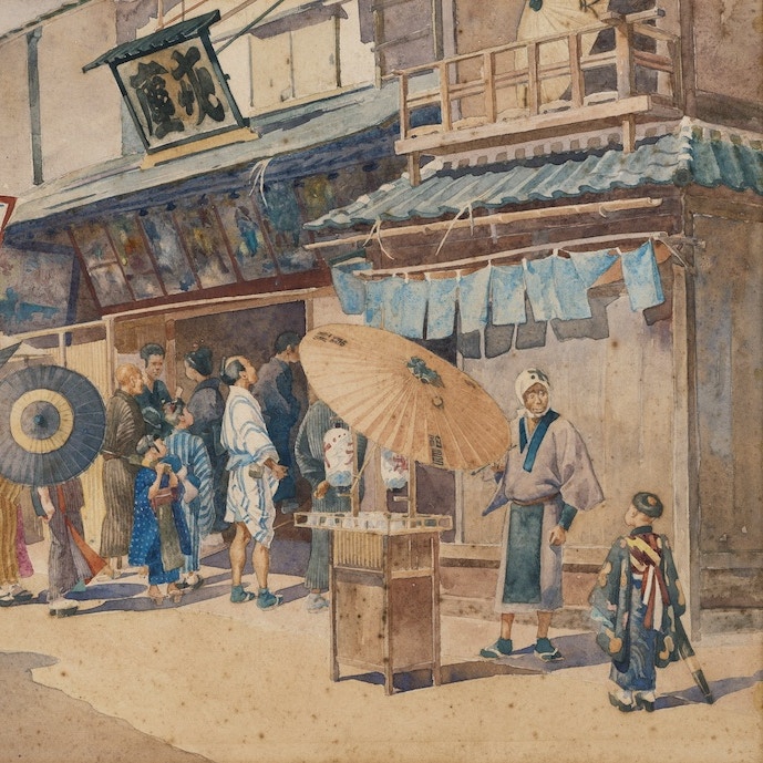 日本の花々や園芸も西洋から日本へ来た旅行者たちを魅了した。花に満たされた屋敷や寺社、街道、農家の庭などの風景に加え、花とともに生きる人の姿も数々の作品に描かれている。花にまつわる作品が、本展の締めくくりとして紹介される。
