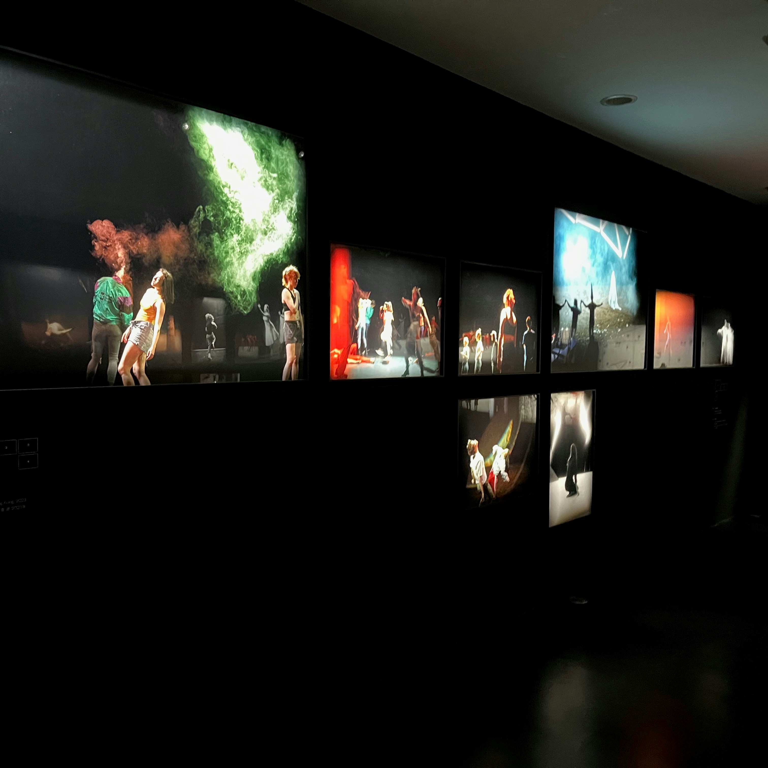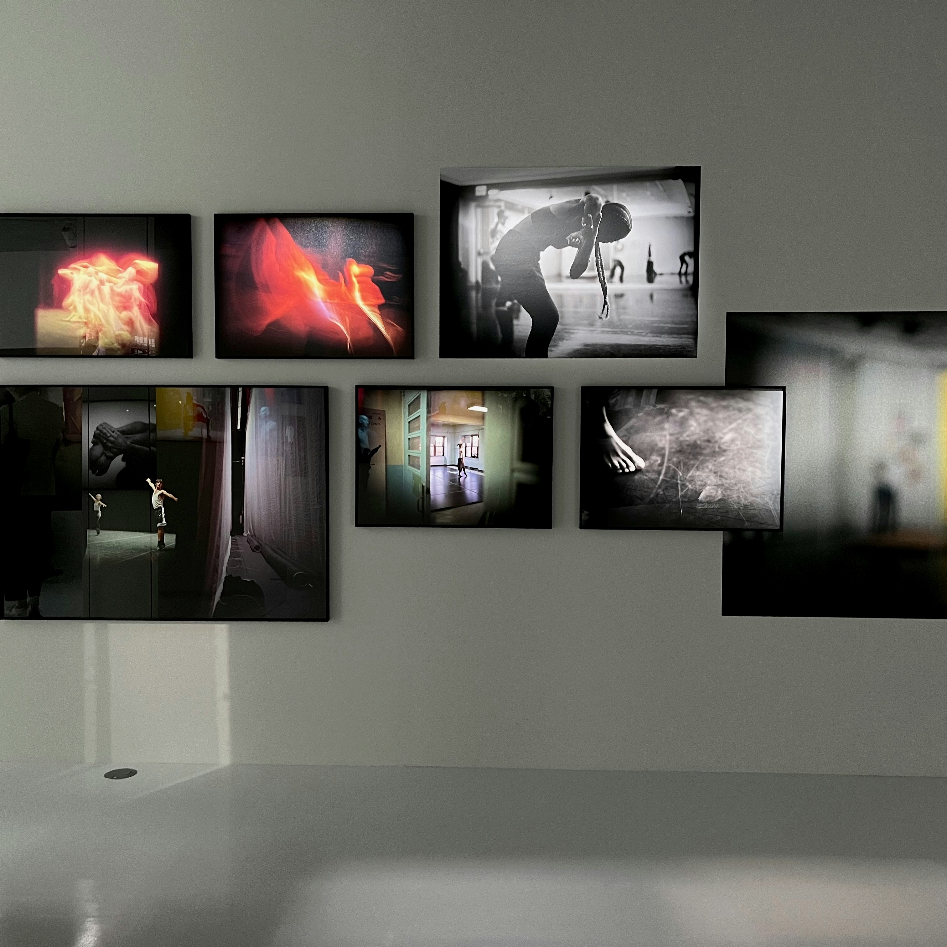 作品は会場の2階と3階で展示。2階は黒い壁で囲われており、まるで公演の舞台のような印象を受ける。スポット照明がステージのようにダンサーたちの躍動する身体をとらえた作品を照らしており、これまで世界各国で行われてきた公演における様々な瞬間が、ビーの感性で写し取られた。