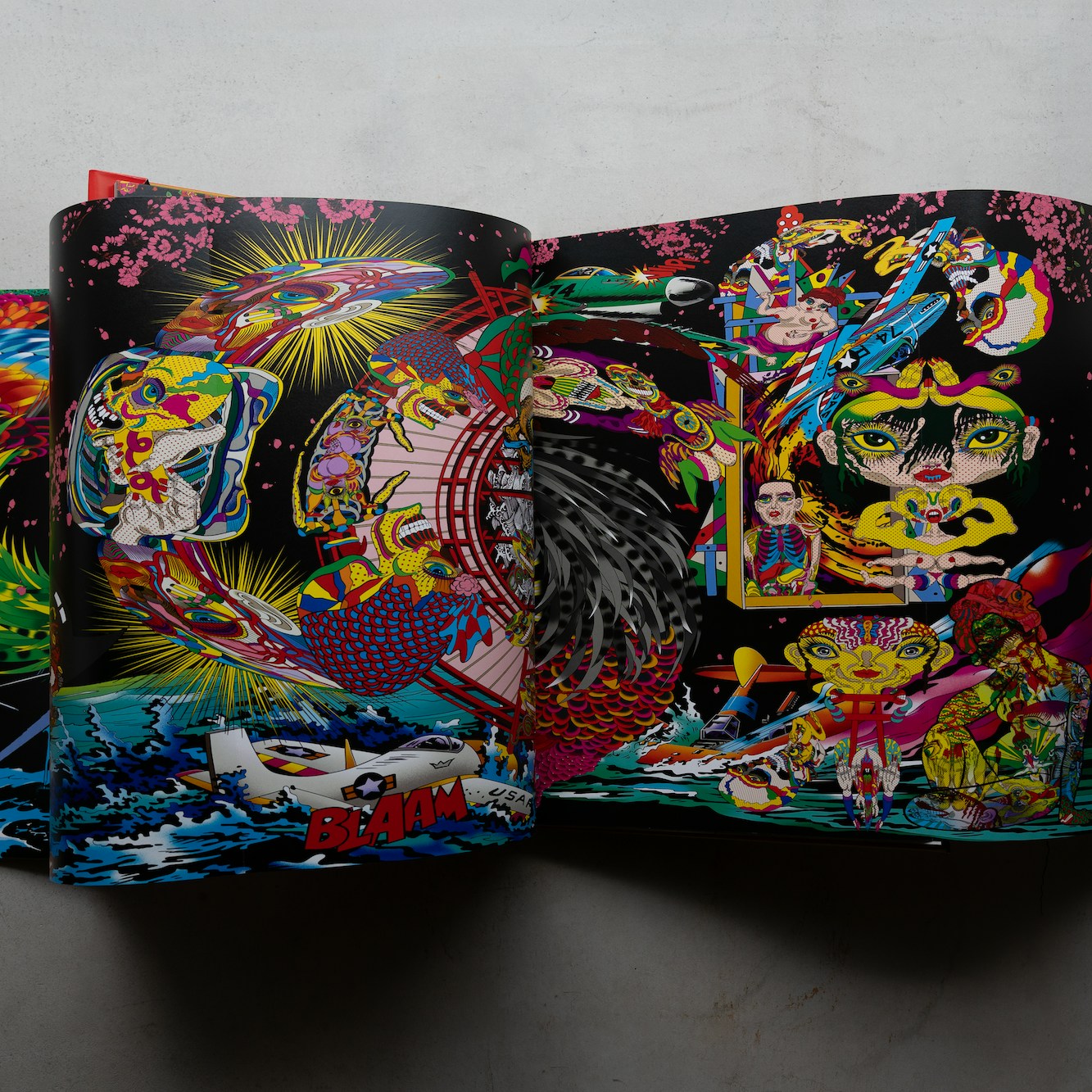 いっぽう、『Quo Psyche』は、上記三部作でフォーカスされたカテゴリーをすべて取り込んだオムニバス的な1冊。無数のキャラクターがコラージュされ生みだされた大作キャンバス作品を中心に、立体物、ドローイング、展示風景、アニメーションの原画、制作工程を垣間見ることのできる指定稿、自身のポートレートなど、田名網ワールドを彩る多種多様な作品群がカオスとなって迫ってくるA3変形、250ページの大型本だ。