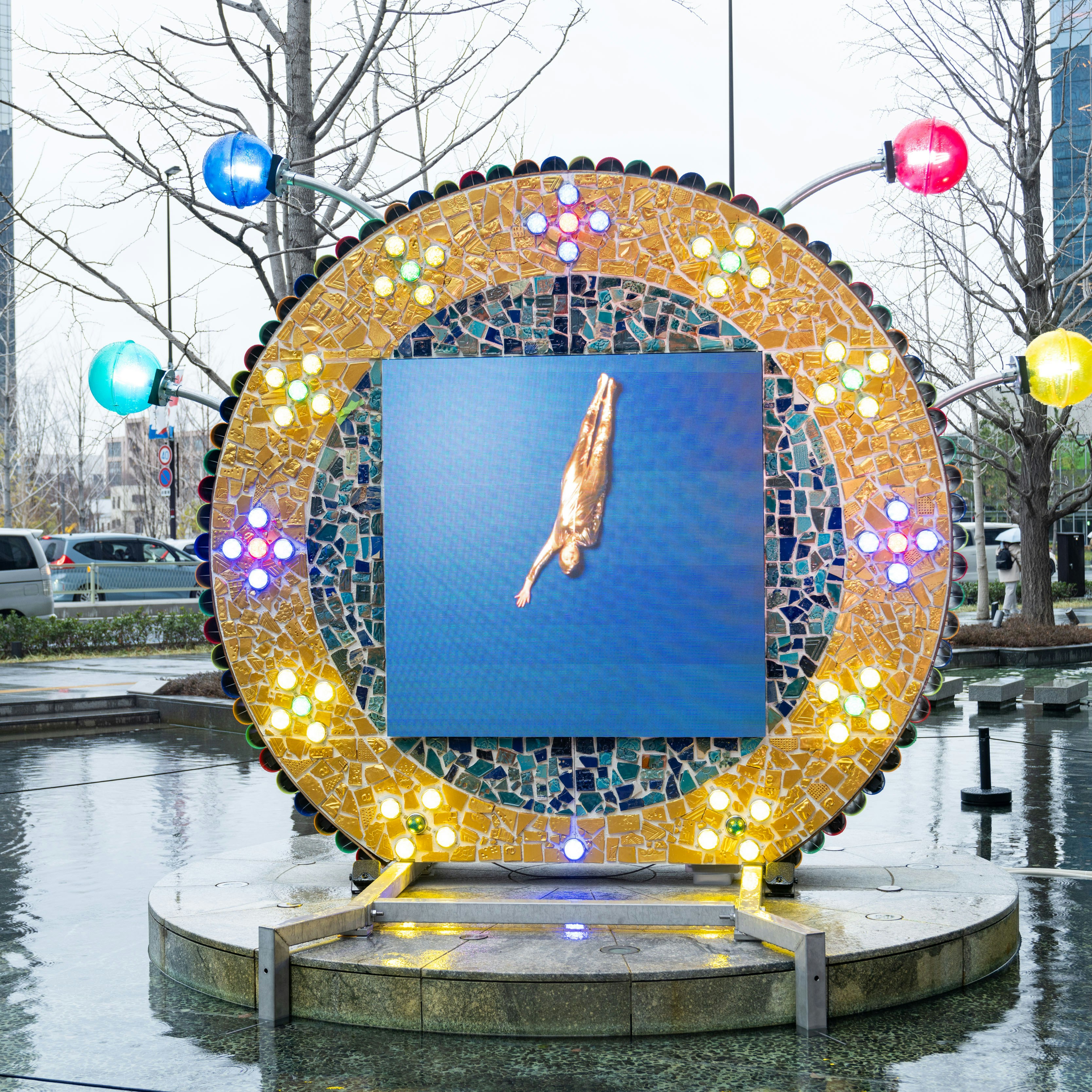 オブジェを制作したのは笹岡由梨子。笹岡は大阪府出身で、映像の中にある絵画との接点を探るべく、絵画における手の痕跡や筆致と近似した、高性能な CG映像にはない異物感や違和感を引き出し、独自のストーリーを紡ぐ作家だ。笹岡は南館せせらぎテラスに大型パブリック・アート《MUSE》を年間通して展示し、グランフロントをアートで彩る。