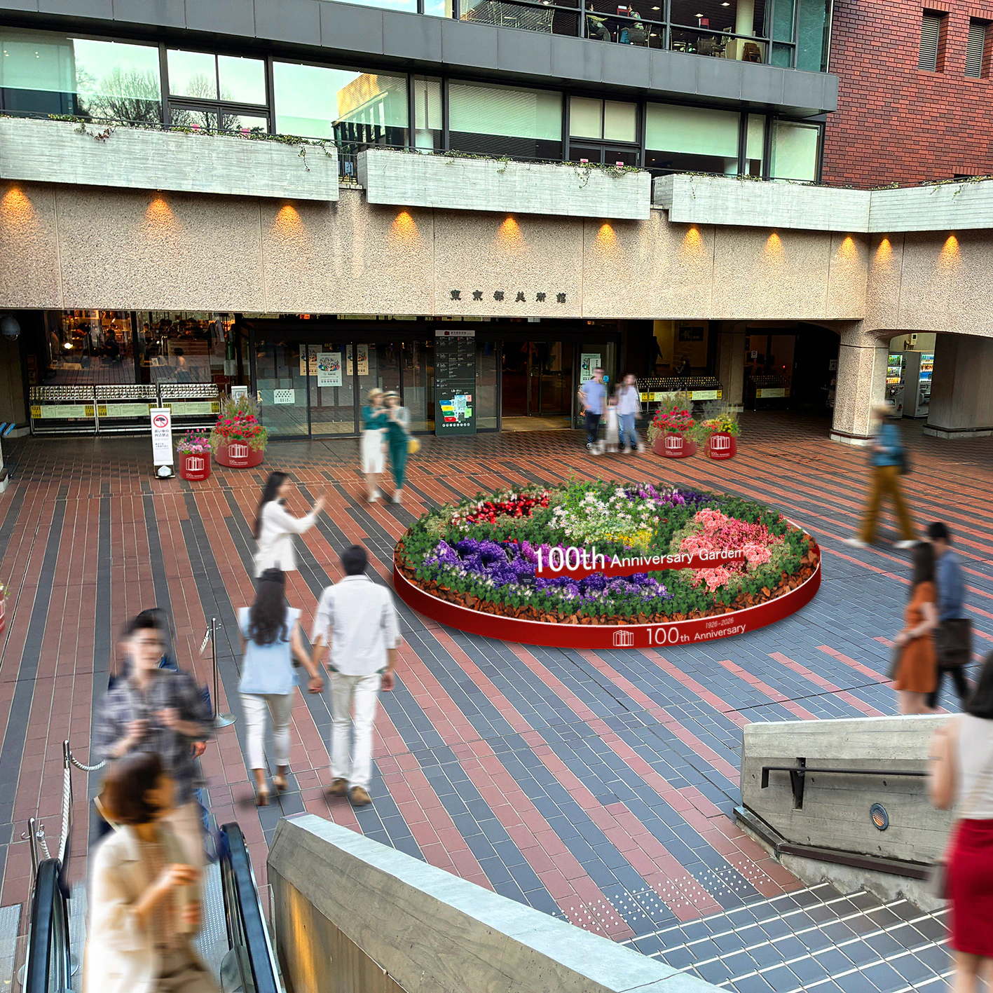 美術館の中庭には、縁起の良い「七宝文様」をモチーフにした直径5メートルの巨大なフラワーガーデンが登場 。開館記念日の5月1日夜にはLEDキャンドルによるライトアップも行われるほか、最終日の5月6日には100名への花鉢プレゼントも予定されている。さらにミュージアムショップでは、100周年ロゴ入りのTシャツやトートバッグ、ツバメノート、オリジナルコーヒーギフトなど、ここでしか手に入らない多彩な記念アイテムが販売される。さらに期間中は正門横にラザニア、ガレット、クレープ、カフェといったバラエティー豊かなキッチンカーが出店する。