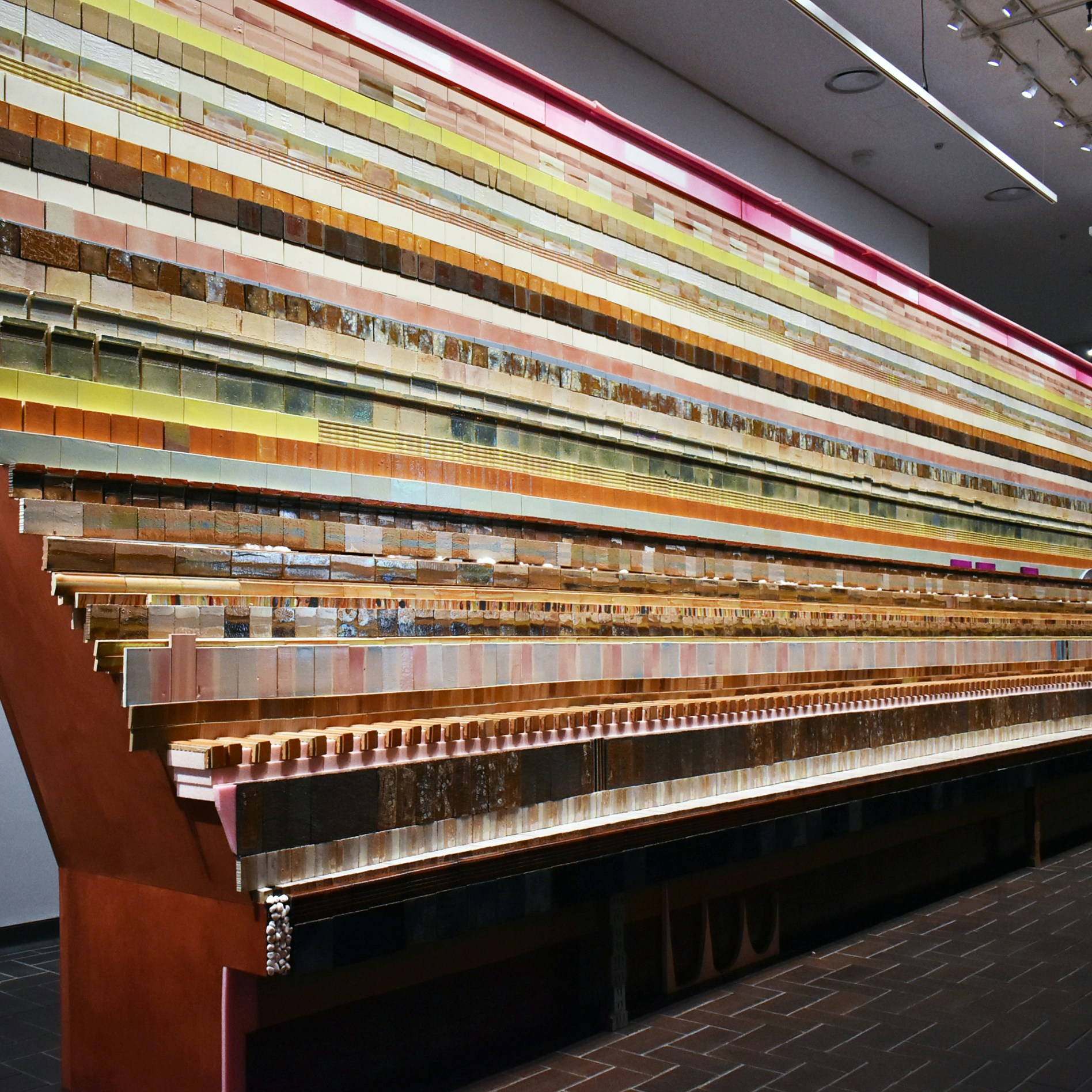 今回、最大の見どころをとなるのはギャラリーCにそびえ立つ、幅15メートル×縦4メートルの大作《module》(2017)。この作品は、美術館に敷かれたタイルやこの空間から着想されたもの。愛知県常滑市にある「水野製陶園」のタイルを用いた初の作品であり、様々な色彩の釉薬がかかったタイルが積みかさなることで、まばゆいばかりの存在感を放っている。
