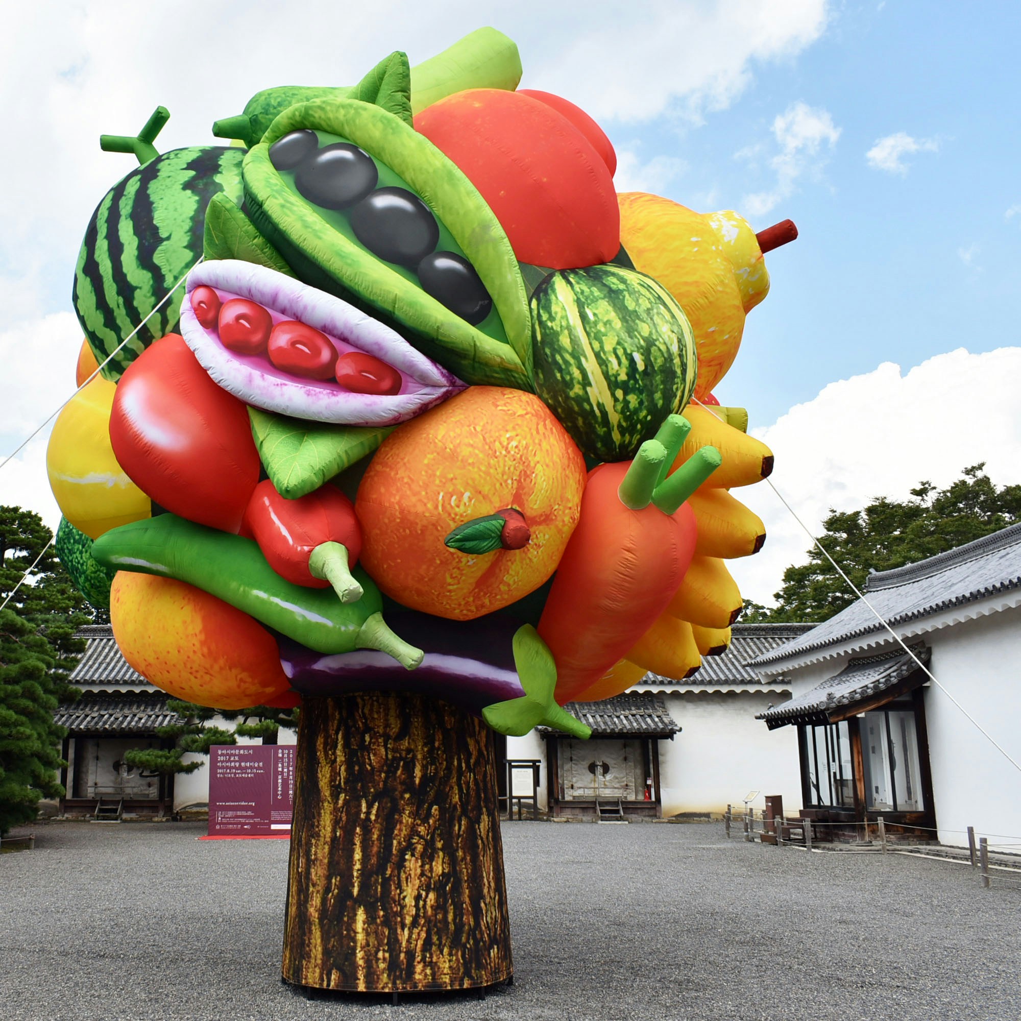 主会場となっている二条城は、建物や庭園がほぼ回廊式、回遊式に連なるように配置されており、作品もその広大な城域の各所に展示されている。まず来場者を迎えるのは巨大なフルーツのバルーン《フルーツの木》(2015)だ。手がけたのは韓国のチェ・ジョンファ。日常的なモチーフをユーモラスで色鮮やかな巨大作品に仕立てた。チェはこのほかにも、伊藤若冲が大根を釈迦に見立てて描いた《果蔬涅槃図》(かそうねはんず)をそのままにバルーンで立体化した《涅槃》(2017)や、キムチ用のザル1万個を使ったインスタレーション《エアー エアー》(2017)などを展示している。