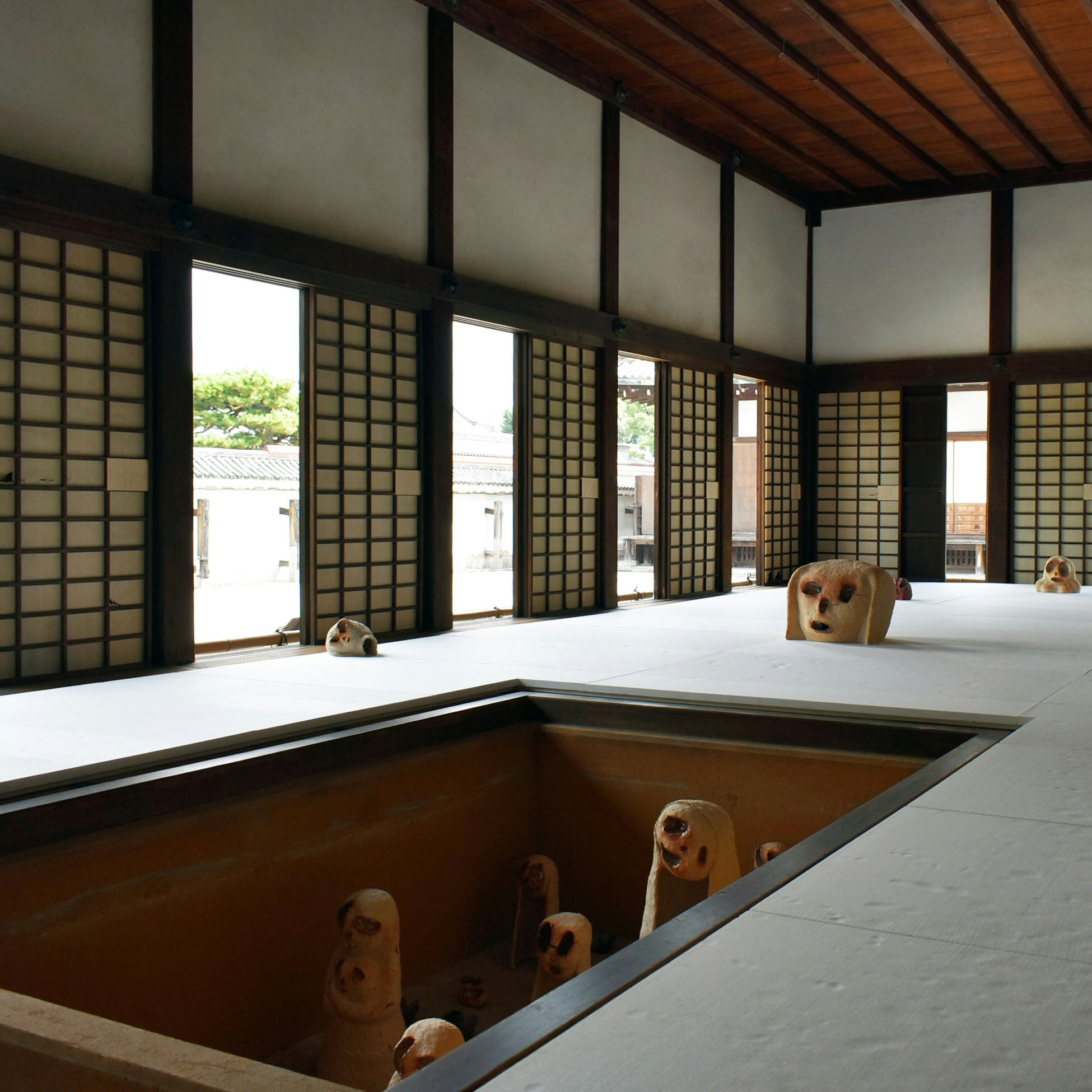 台所に隣接し、煮炊きをしていた穴が残る「御清所(おきよどころ)」では、京都在住の谷澤紗和子がプリミティブな雰囲気をたたえる新作《容》(2017)を展開。「二条城でこれまで使われたことがない素材を使いたかった」と話す谷澤は、畳の間に大胆にも発砲スチロールを畳の上に敷き、貝で目をしつらえた焼き物のオブジェを並べた。「陶芸は火を使ってつくるものであり、貝が作品にもたらす目の穴がここの場所とシンクロすると思いました」。この場所には手びねりの陶芸の表面と、鑑賞者の足跡でできる地面のディテールが時間が経つにつれて重なっていくという狙いもあるという。