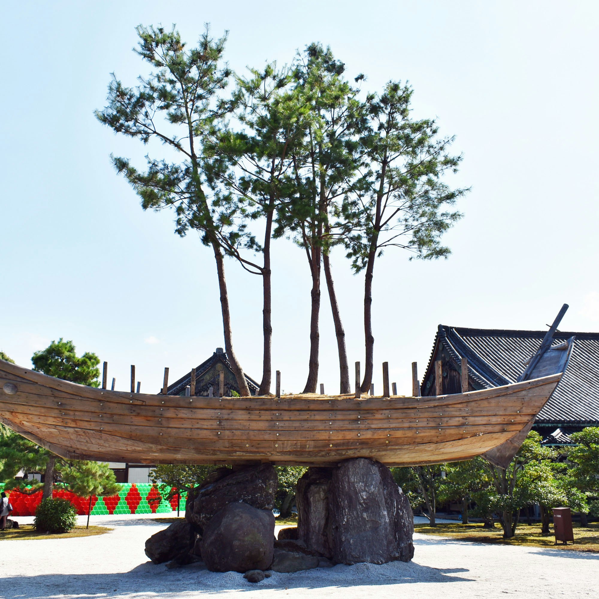 建畠が今回の「アジア回廊 現代美術展」のシンボルとも言うべき作品であると話すのが、ツァイ・グオチャン(蔡國強)の《盆栽の舟》(2017)だ。二の丸御殿の庭に突如として出現する巨大な木造の船。これは、ツァイが16年の「東アジア文化都市2016奈良市」で東大寺の池に設置した木造船を二条城に移設したもの。舟を鉢に見立て、5本の松の大木が植えられたこの作品は、それ全体が盆栽を表している。東アジア全体の文化交流を示しながらも、「東アジア文化都市自体も、ただの飾り物、一夜城にすぎない」という皮肉が込められているとツァイは話す。