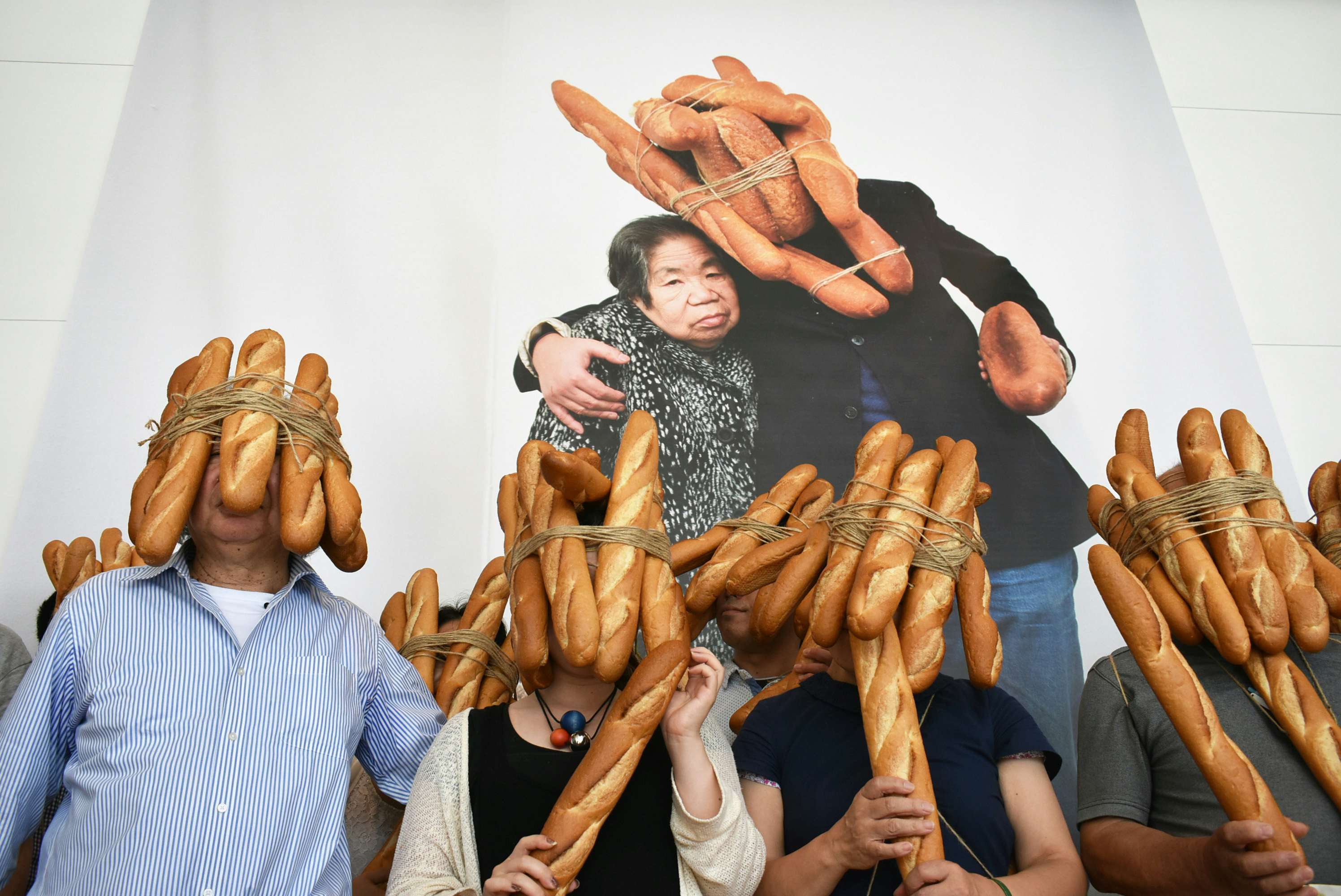 富山県美術館に集まったパン人間たち。手前は折元立身
