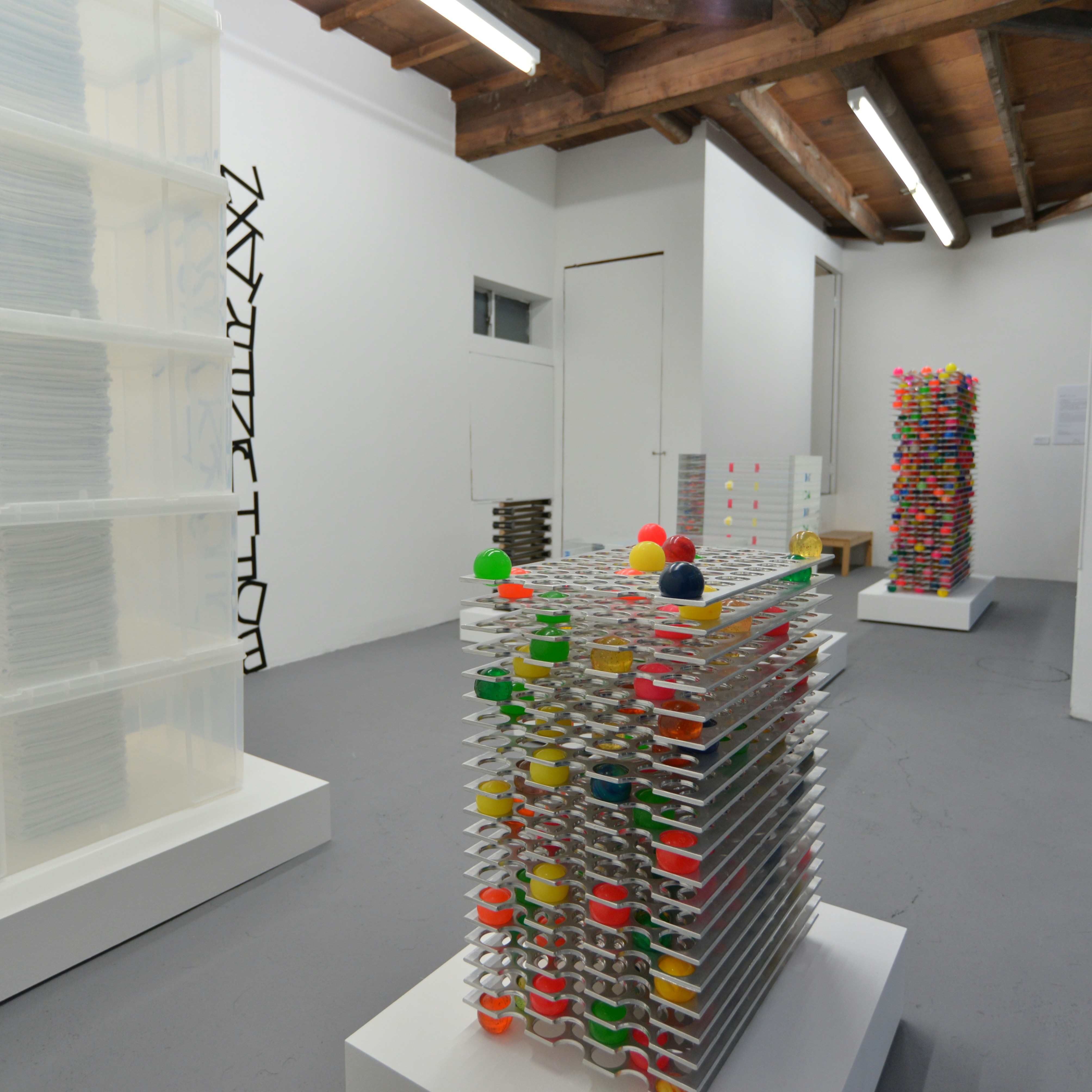 また街中のガレージでは、他人のヘッドフォンやイヤホンの音漏れに合わせてダンスをするパフォーマンスを記録した小山友也の《Dancing by myself》を展示。ボタンギャラリーでは、身の回りにある日用品を組み合わせて彫刻作品をつくり上げる冨井大裕が代表作品である「ball sheet ball」シリーズの最新作を見せる。