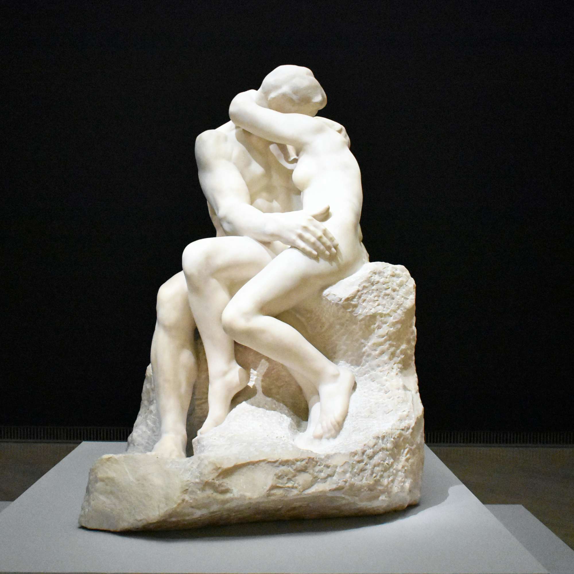 《接吻》は、高さ180センチ余りの大理石彫刻。世界にたった3点しか存在しない傑作であり、今回が日本初来日となる。2人の男女が抱擁し、唇を重ねた瞬間を表した本作は「男女の愛を永遠にとどめた」とも評される作品。その巨大さに圧倒されるとともに、ロダンならではの肉感が、思わず大理石であることを忘れさせる。