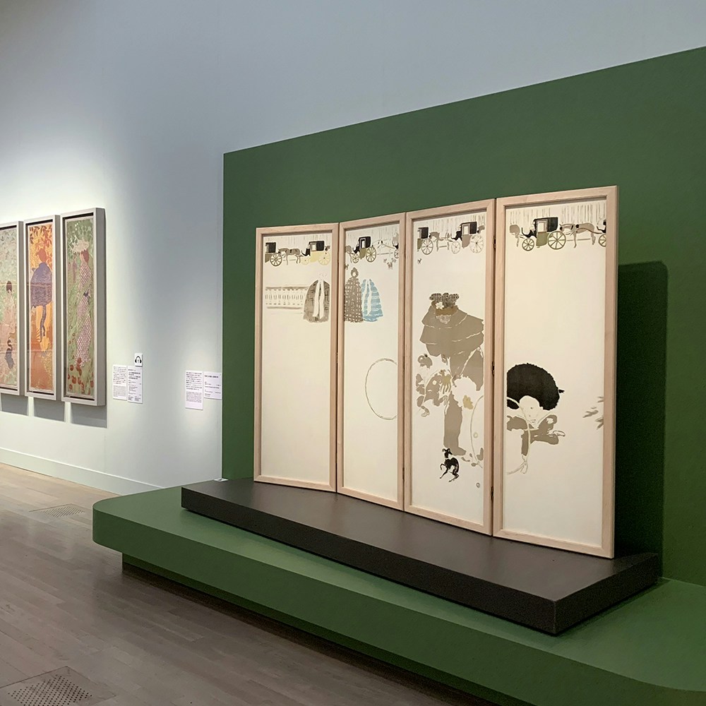 例えば、《乳母たちの散歩、辻馬車の列》は4点1組の屏風形式の作品。屏風という表現方法そのものに加え、余白の取り方や腰をかがめた女性の姿などからは日本の浮世絵の影響が見てとれる。
