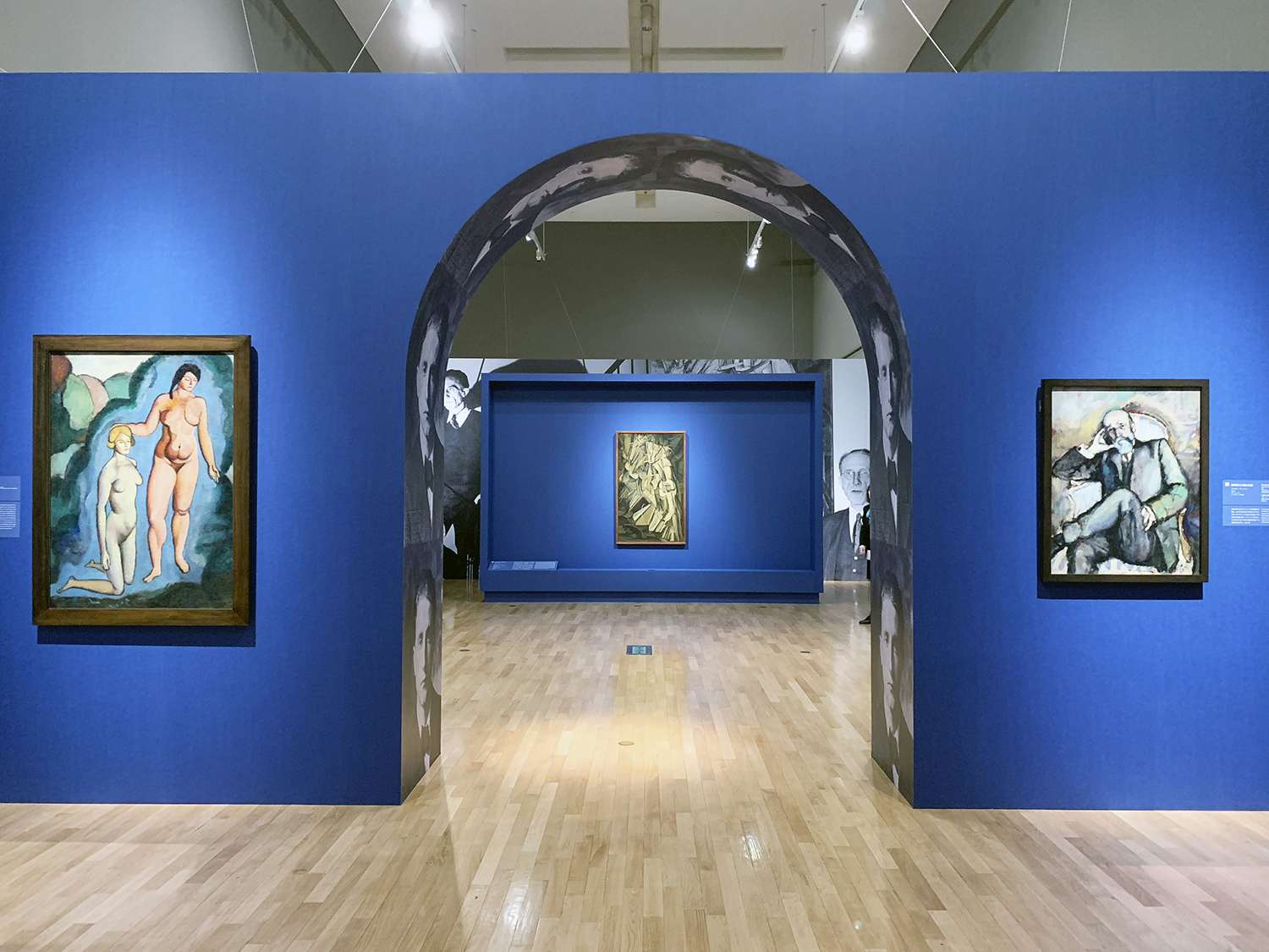会場風景。左から《叢》(1910-11)、《階段を降りる裸体 No.2》(1912)、《芸術家の父親の肖像》(1910)