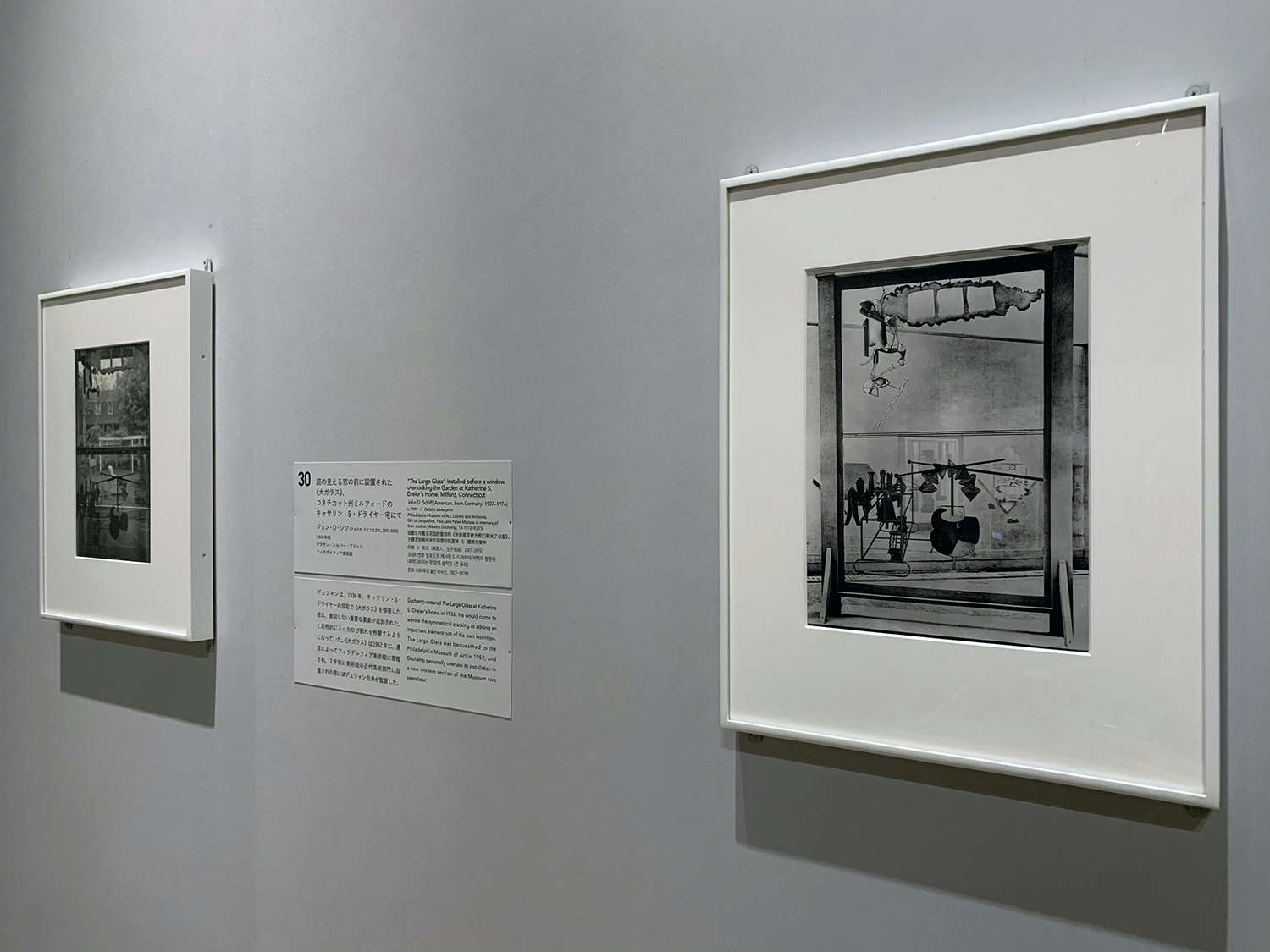 展示風景より手前が《彼女の独身者たちによって裸にされた花嫁、さえも》の「国際モダンアート展」(ブルックリン美術館、1926)での展示風景写真