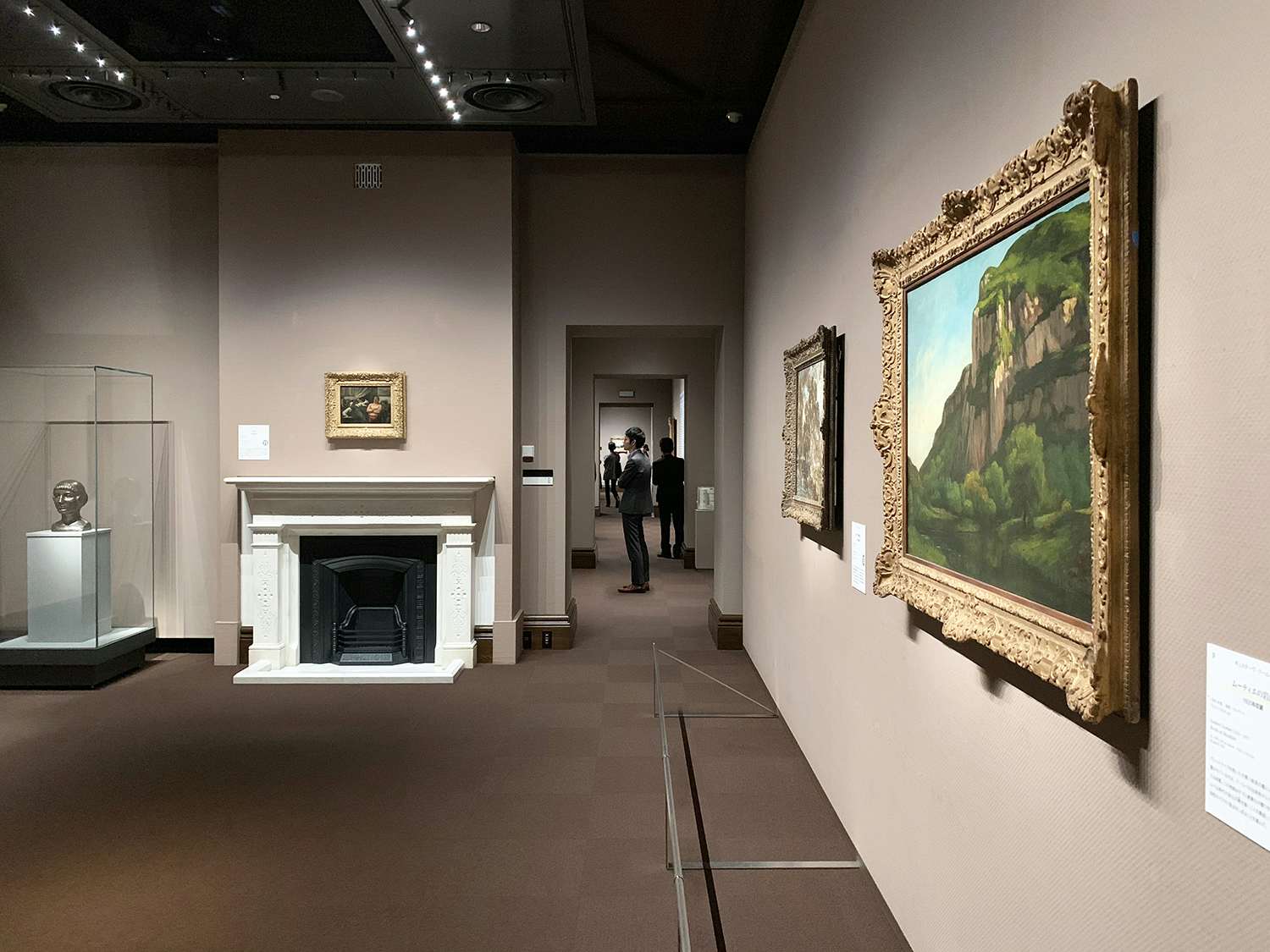 会場風景。手前はギュスターヴ・クールベ《ムーティエの岩山》(1855頃)