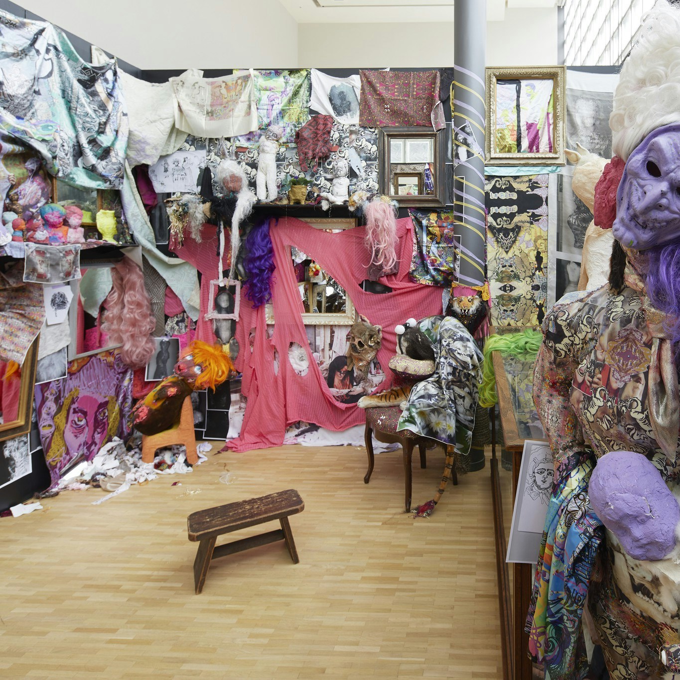 ヴィジュアル・アーティストであり、パフォーマンスも手がけるジェニファー・ヴィネガー・エイヴリーは、会場内にエルメスの展示空間とはまったく異なる装飾的な小部屋を出現させた。リヨンのホールディング・テキスタイル・エルメスに滞在したエイヴリーは、その工房で捨てられていたシルクの切れ端やコピー用紙、粘土など様々な素材を収集。職人たちとともに、廃棄物を使ったキャラクターの集合体を生み出した。