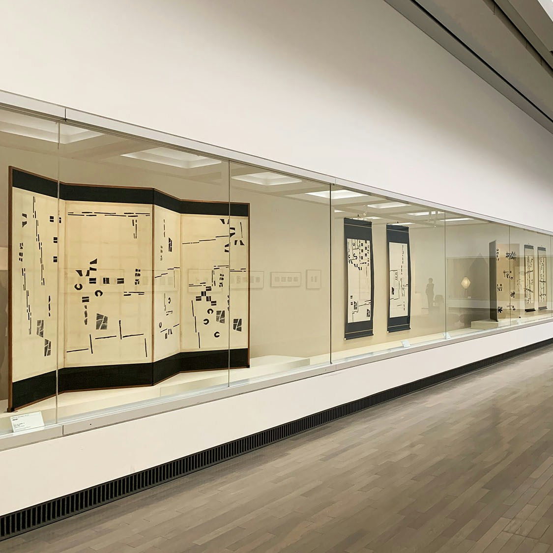 これは、ノグチ来日の際、京都の桂離宮へ旅行したことをきっかけに制作されたもの。長谷川は自宅の台所にあったかまぼこ板に丸や矩形を彫り、ポスターカラーを塗って紙に捺してできた白黒の版画を、屏風に配置した。桂離宮の建築などからインスピレーションを得た本作について、本展担当学芸員の中村尚明は「伝統的な文化遺産をそのまま模倣するのではなく、その本質を新しい作品へと昇華させた」と話す。