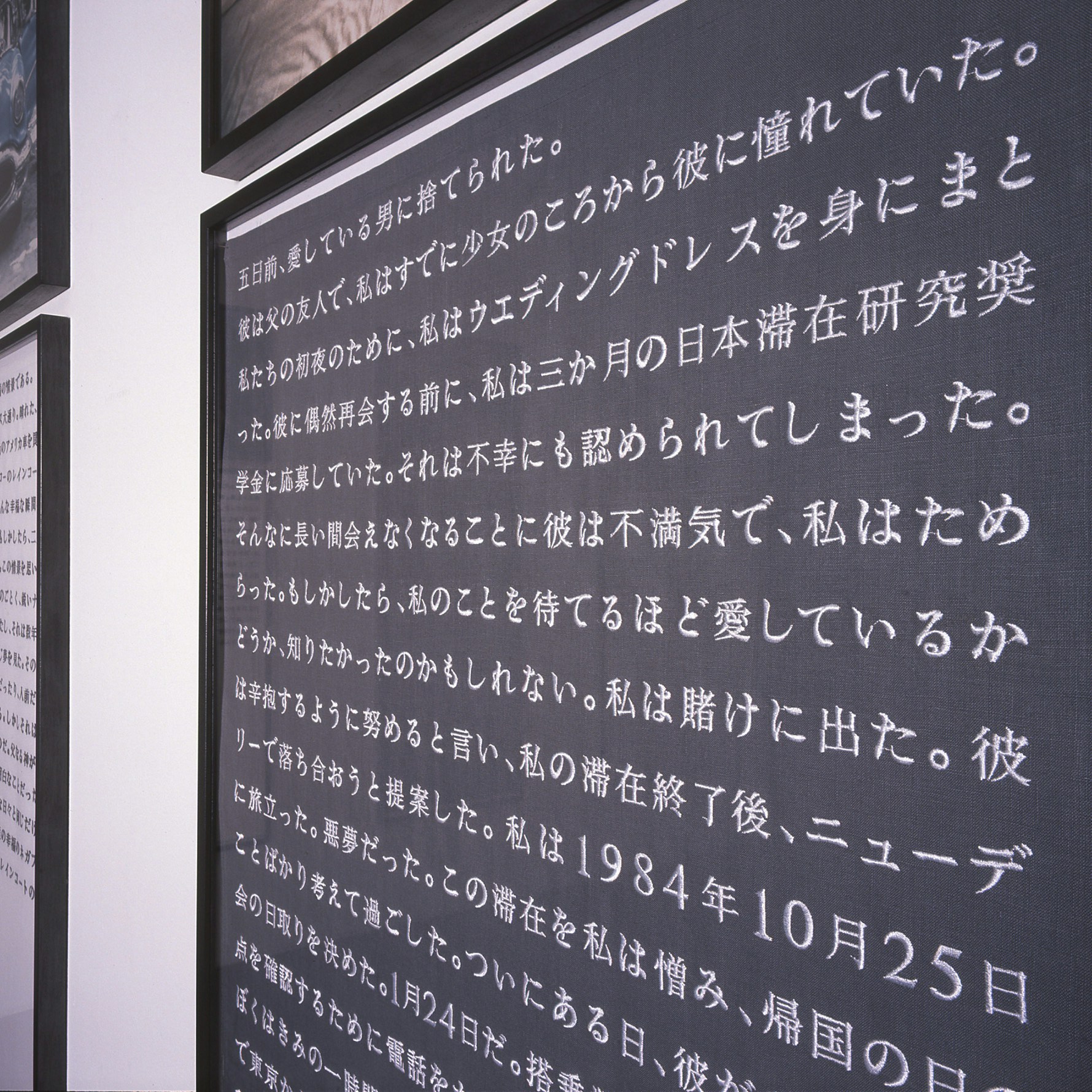 この別離は日本での滞在が原因だと考えたカルは、この出来事を1日につきひとりの相手に語り、その話し相手にも自らの苦しみを語ってもらうという行為を開始した。展示室2階に並ぶのは、精緻に刺繍されたテキストの数々だ。カルが「不幸の日」を振り返るテキストと、話し相手によるテキストが、交互に壁に掛かる。