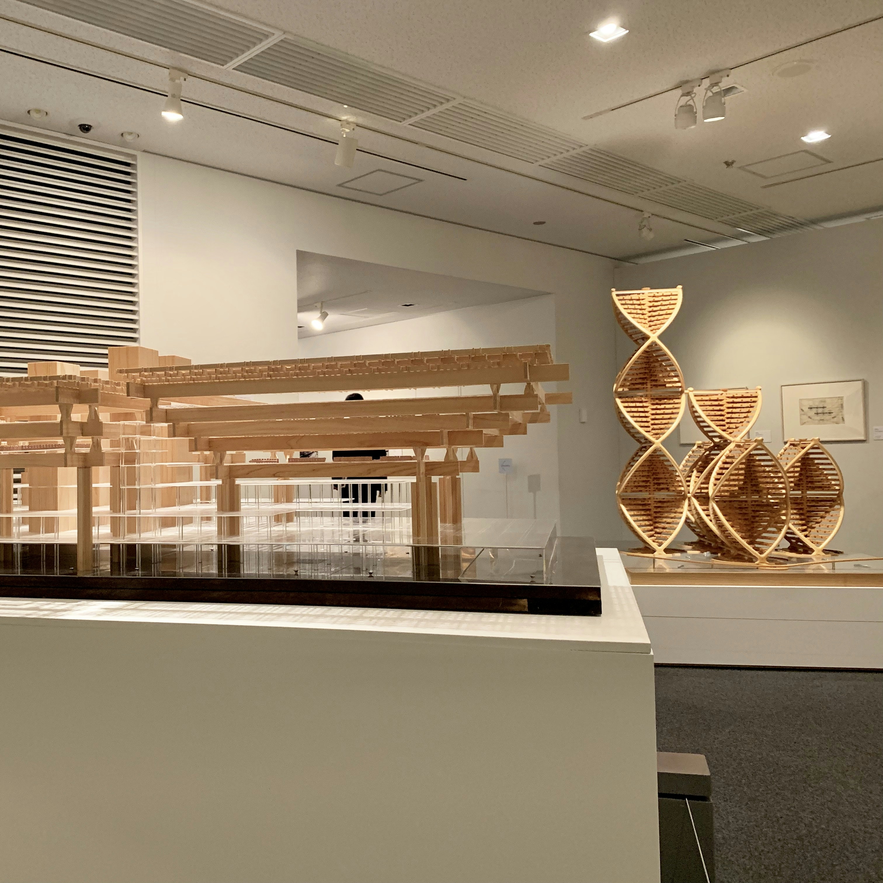 会場風景より、手前から菊竹清訓《国立京都国際会館設計競技案》の100分の1模型(制作=早稲田大学古谷誠章研究室)、黒川紀章《東京計画1961-Helix計画》の模型