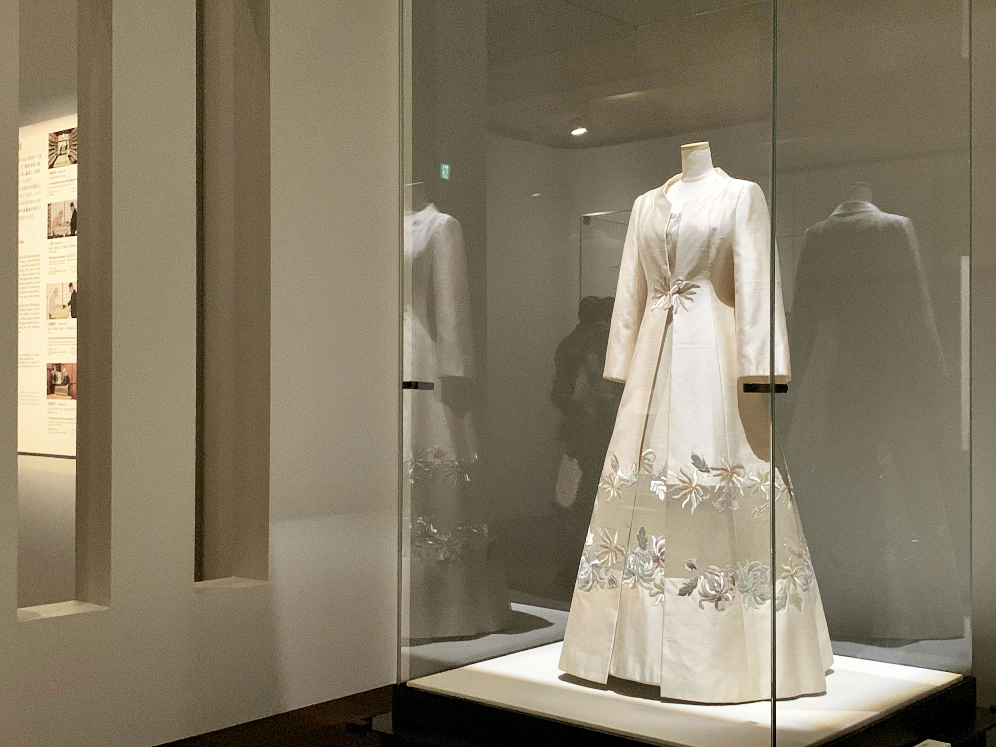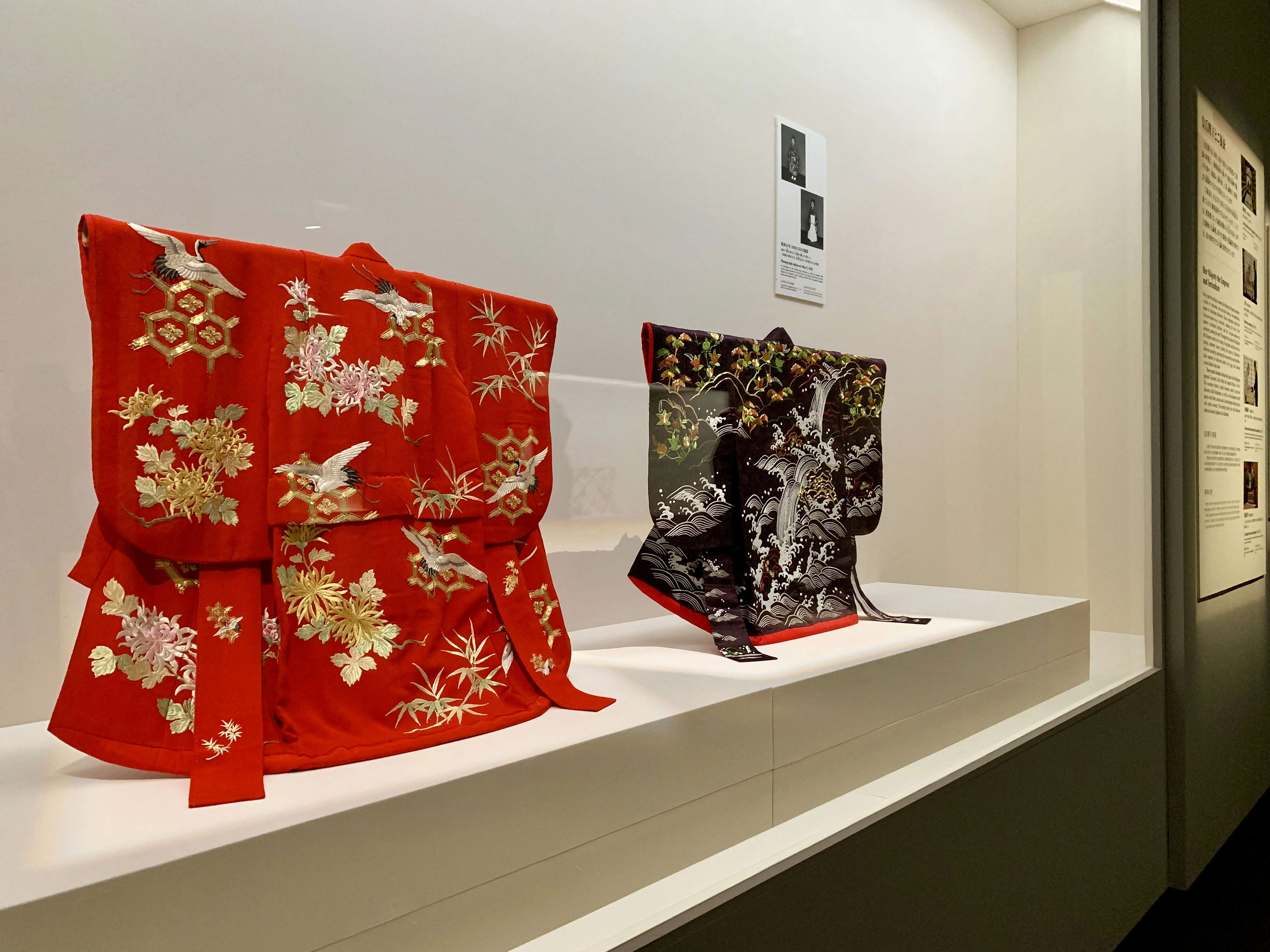 展示風景より、左から《赤縮緬地吉祥文様刺繍振袖》(1935)、《黒紅綸子地落瀧津文様振袖》(1938)