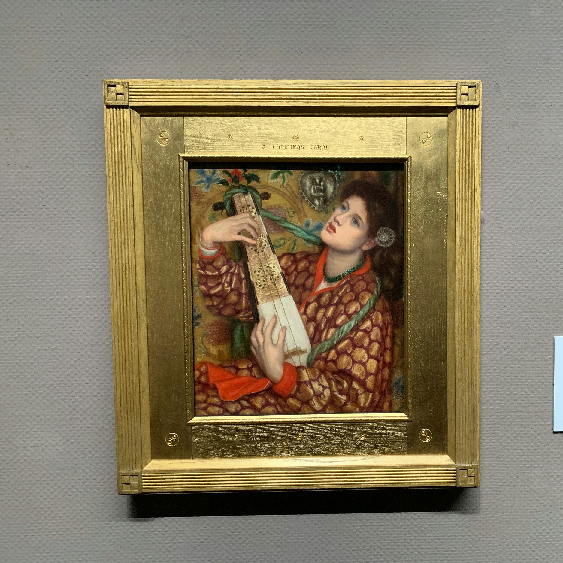 ラファエル前派のなかでも、ロセッティはその華やかな表現がとりわけ目を引く。神話上の人物であるウェヌスを描いた《ウェヌス・ウェルティコルディア(魔性のヴィーナス)》、一編の詩をもとに描かれた《祝福されし乙女》といった様々な女性像が並ぶが、なかでもニューオルが「重要作」だと強調するのは、今回日本で初披露される《クリスマス・キャロル》だ。ロセッティが多数描いた楽器を持つ女性像。本作では音楽への恍惚が豊かに表されている。