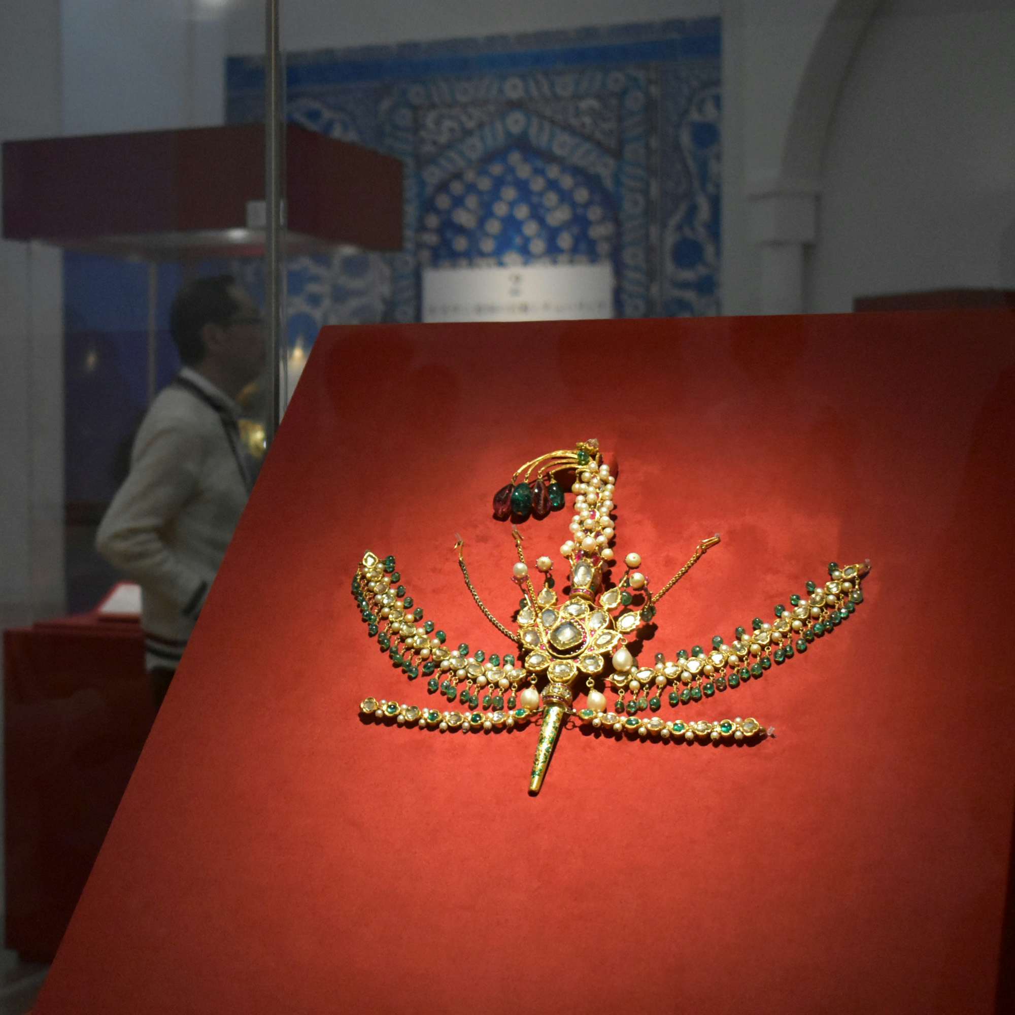 本展の冒頭に並ぶのは、《スルタン・メフメト4世の宝飾短剣》(1644頃)や《礼装用兜》(1550頃)など、宮廷工房で制作された衣装や宝飾品、武具、家具調度など、スルタンの威光をさらに輝かせるための宝物の数々だ。