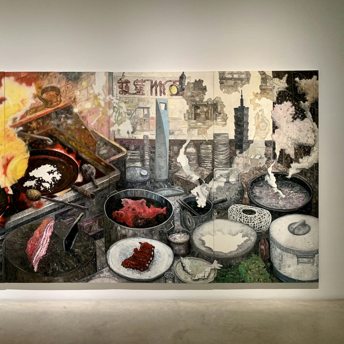 また、瀬戸内国際芸術祭への参加経験から描かれた瀬戸内海・男木島がテーマの作品や、中国を中心とするアジア圏のダイナミックな経済を一枚のキャンバスに描いた《アジアの台所》(2008)など、アジアに頻繁に訪れる大岩ならではの視点が面白い。
