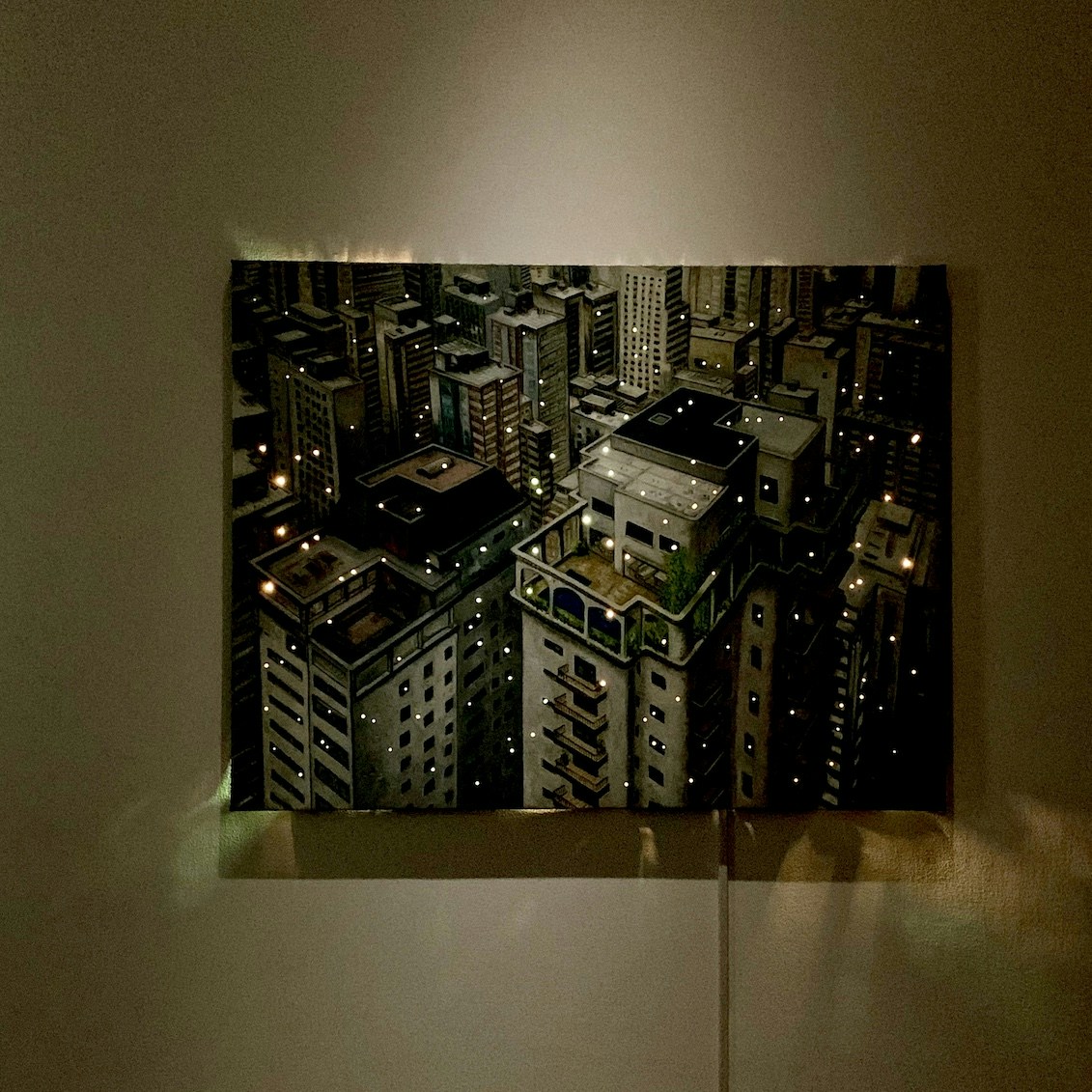 近作を中心とした約60点が並ぶ本展は、6つの章から構成されている。大岩が2002年から暮らすアメリカ・ニューヨークの風景を題材にした第1章「波に包まれるニューヨーク市」では、街の宙を流れる電波のイメージを描いた《ワールド・ワイド・ウェブ・ウェーブ1(ロングアイランドシティ)》(2017)などを展示。