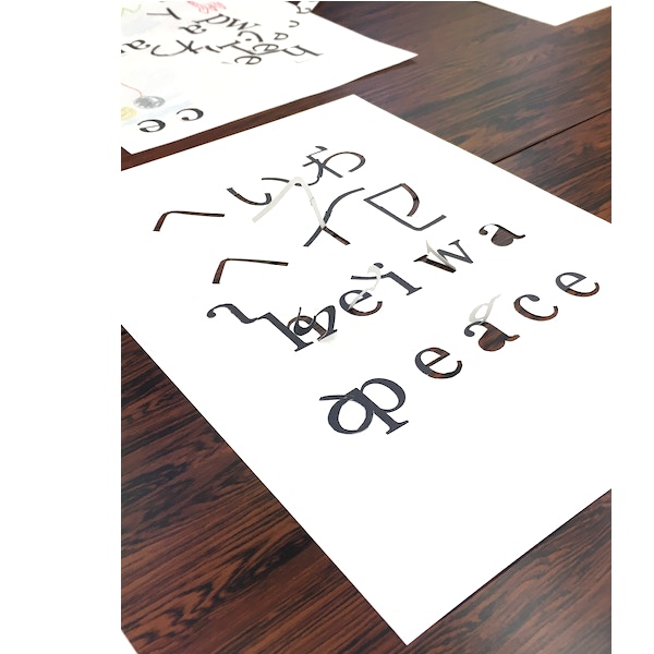 「別の惑星の文字をつくってみる」は、アルファベットやひらがななどを自由に再構築して、ある意味を表すオリジナルの文字を新しくつくる課題だ。まずは、田中教諭がこの授業を発想したきっかけだという、異世界の不思議な文字が登場する、絵本作家ショーン・タンによる作品を紹介。「平和」を表現する世界の文字を見て文字の形や仕組みのバリエーションを実感したあと、「へいわ heiwa」の文字が印刷されたワークシートを切り貼りして、思い思いに「平和」を表現する文字を制作した。