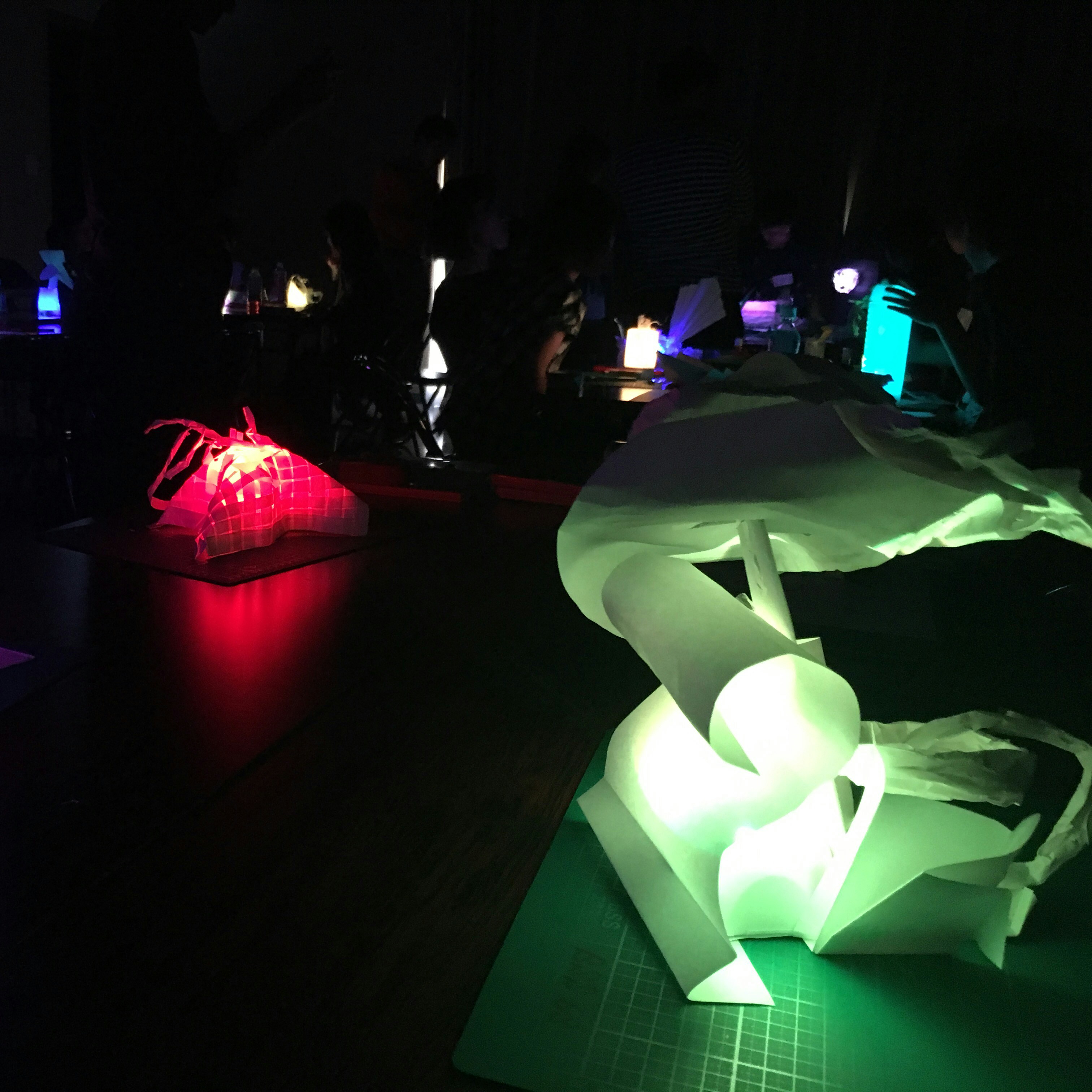 できた作品は幾何学的なパターンを使ったもの、動植物のようなものなどバリエーション豊か。最後は7色に光る「デコデコLEDライト」(提供=美術出版エデュケーショナル)を使い、できた作品をライトアップして、お互いの作品を鑑賞した。光を当てることで作品の見え方が大きく変化する様子に、歓声があがった。