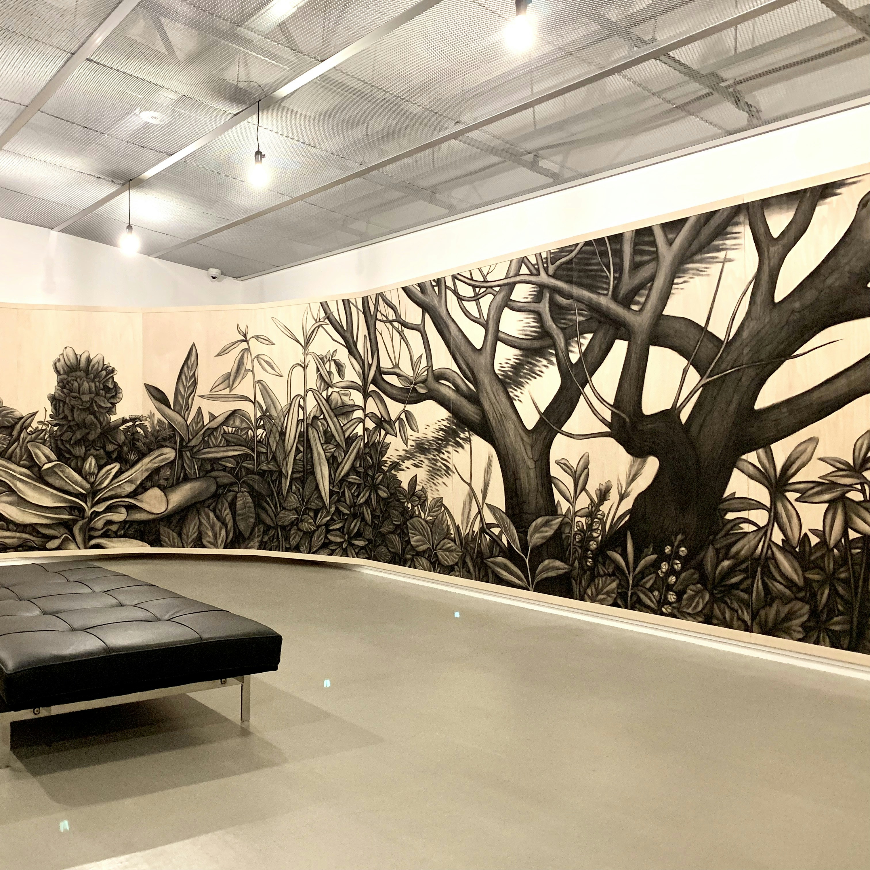 佐藤は思春期を過ごした荻窪を訪れた際、そこが「廃墟化された街」のように見えたのだという。そして東日本大震災後、再び同所を訪れた佐藤の目には、街が「植物で覆われた秘境」のように映る。このことを契機とし、本格的な絵画制作をスタート。13年に描き始めた、植物を主題とした木炭壁画《そこで生えている。》は、いまや幅160メートルを超え、増殖を続けている(本展では《その後の「そこで生えている。」》としてその一部を展示)。