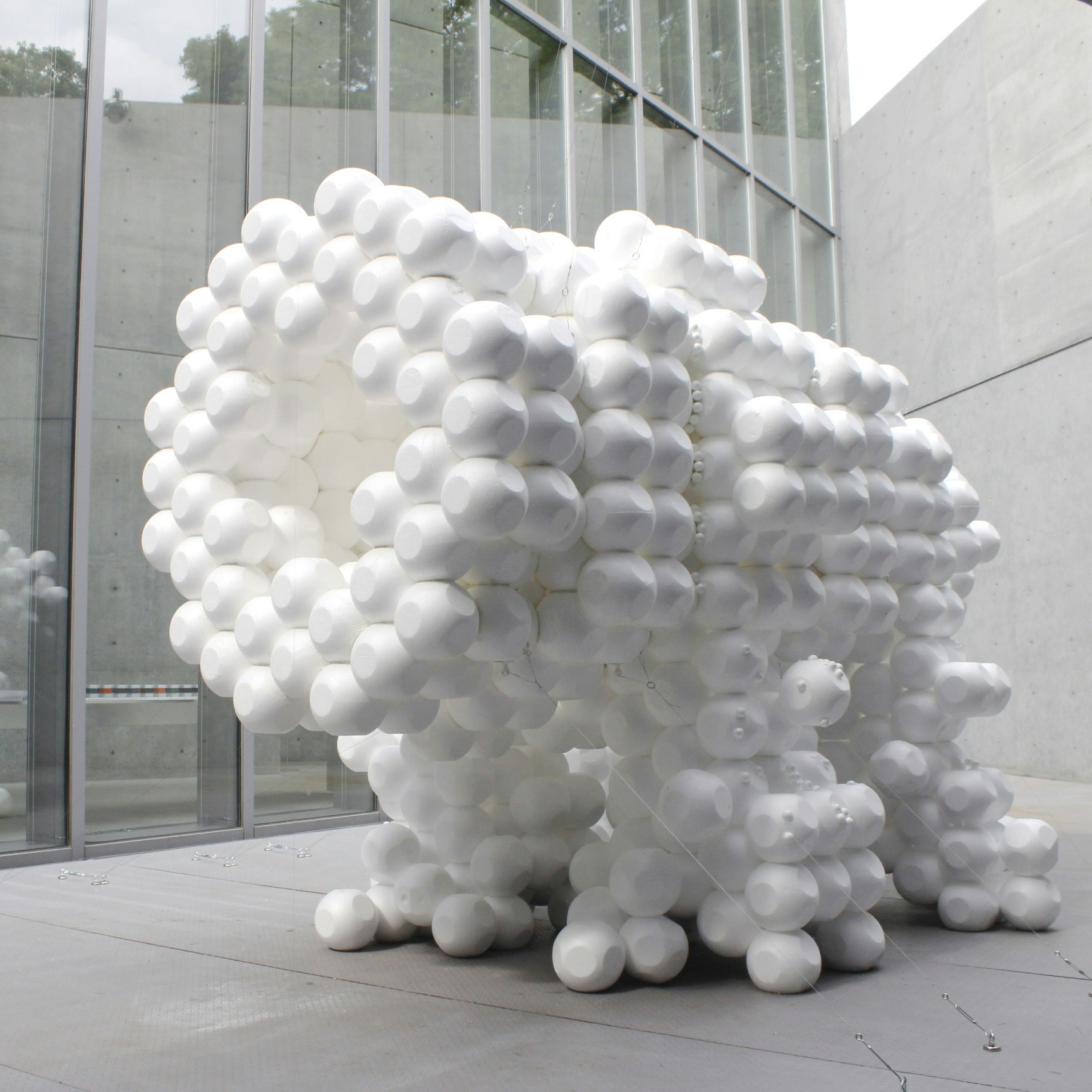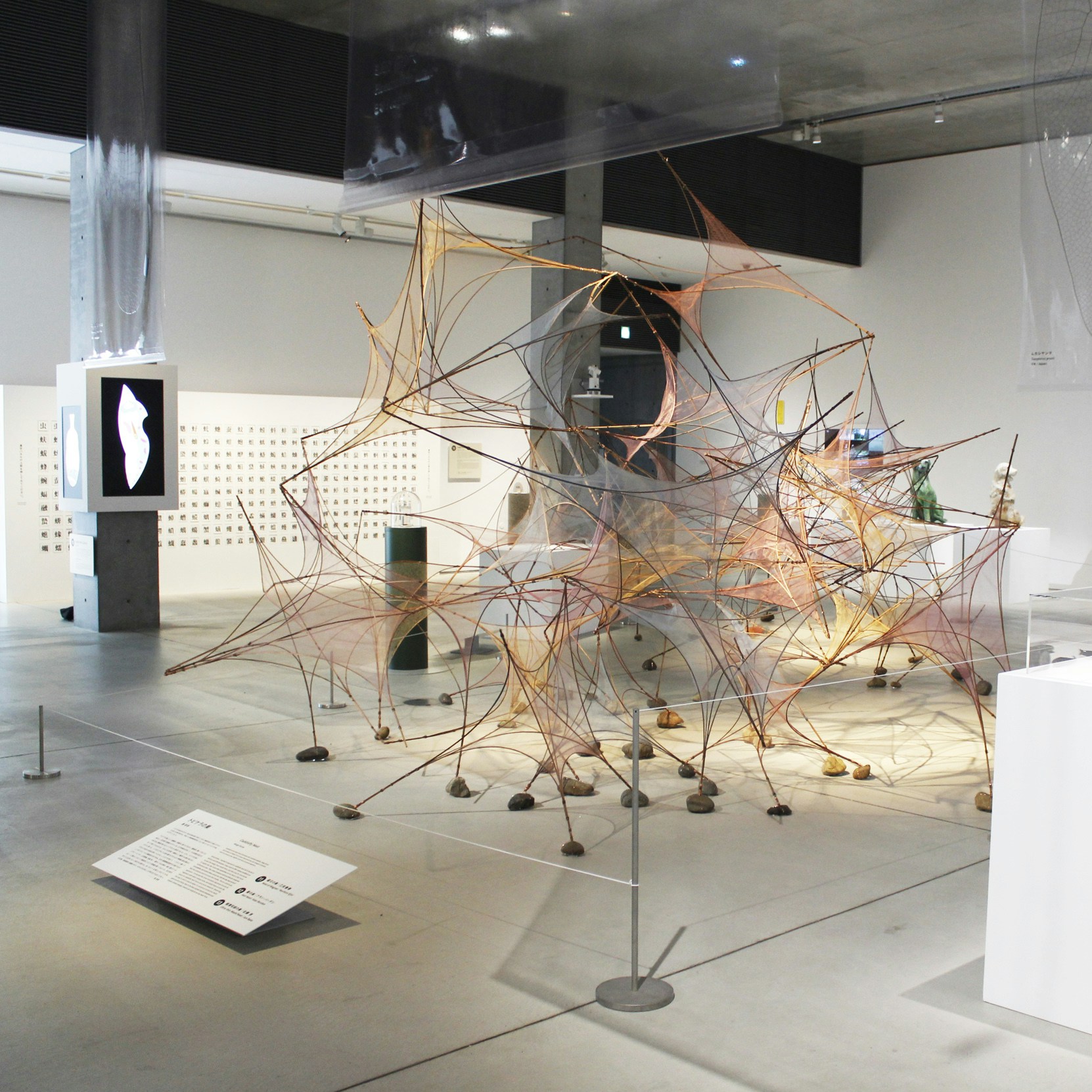 続く大きな展示室では、虫を「デザインのお手本」とした作品群が一堂に会する。養老による虫のための慰霊碑「虫塚」のデザインでも知られる建築家の隈研吾は、日本の建築構造設計を代表する3人とともに、トビケラが水中で身近な材料を集めてつくる巣をモチーフに作品を発表。磁石と接着剤を用いた人間のためのシェルターである《磁石の巣》、髪の毛とナッツの殻を組み合わせたパネルで建てた《髪の巣》、そして世界で最も薄い和紙で作られた《極薄和紙の巣》を見ることができる。