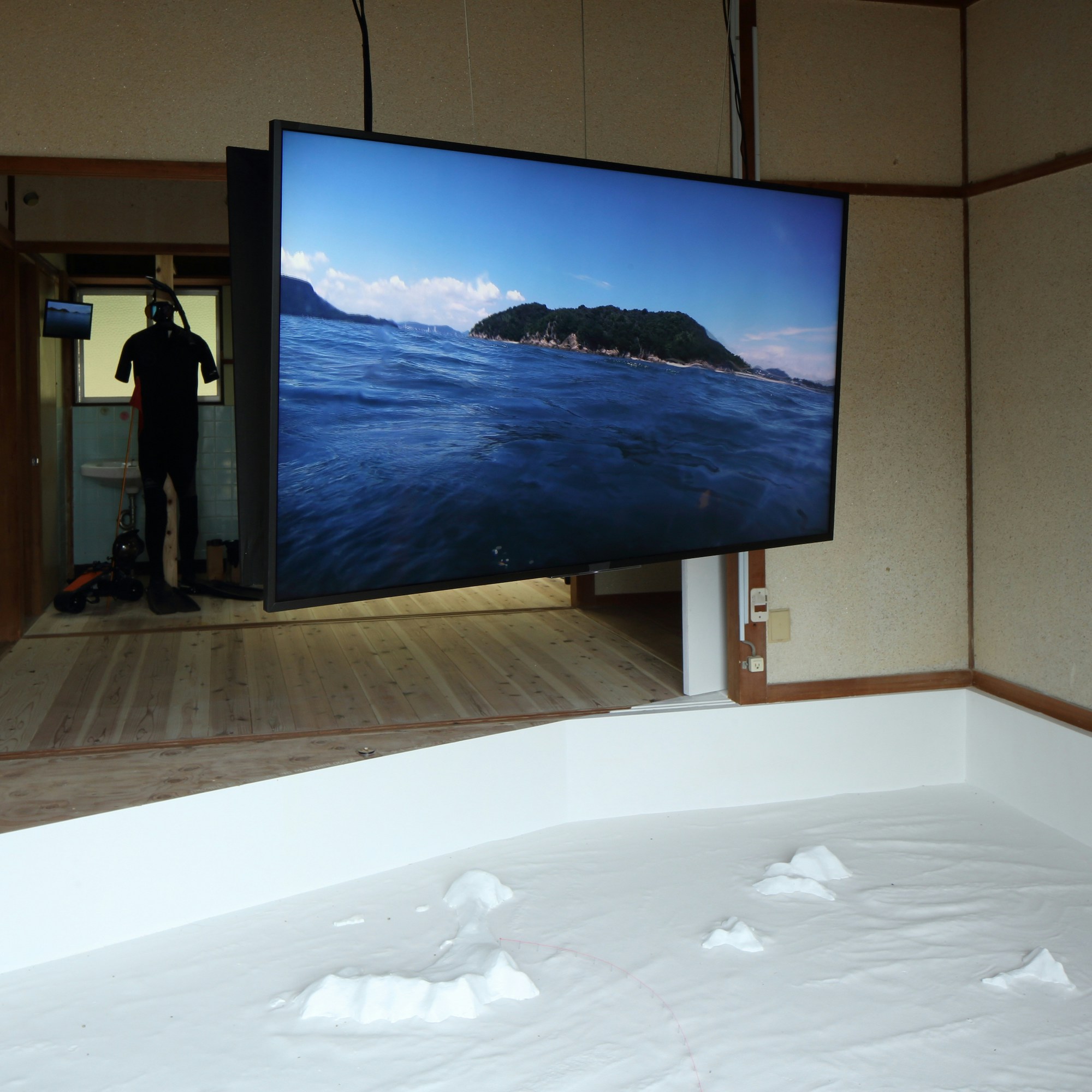 また、かつて自由を求めて大島から対岸の庵治町へと海を泳いで渡ろうとした患者たちの経験をもとにした作品は、山川冬樹の《海峡の歌/Strait Songs》(2019)。庵治海岸から大島へ、海峡を泳いで渡る山川のパフォーマンスを記録したふたつのビデオ・インスタレーションを展示。映像のなかでは、大島の歌人や庵治の子供が詠んだ短歌の声も流されている。