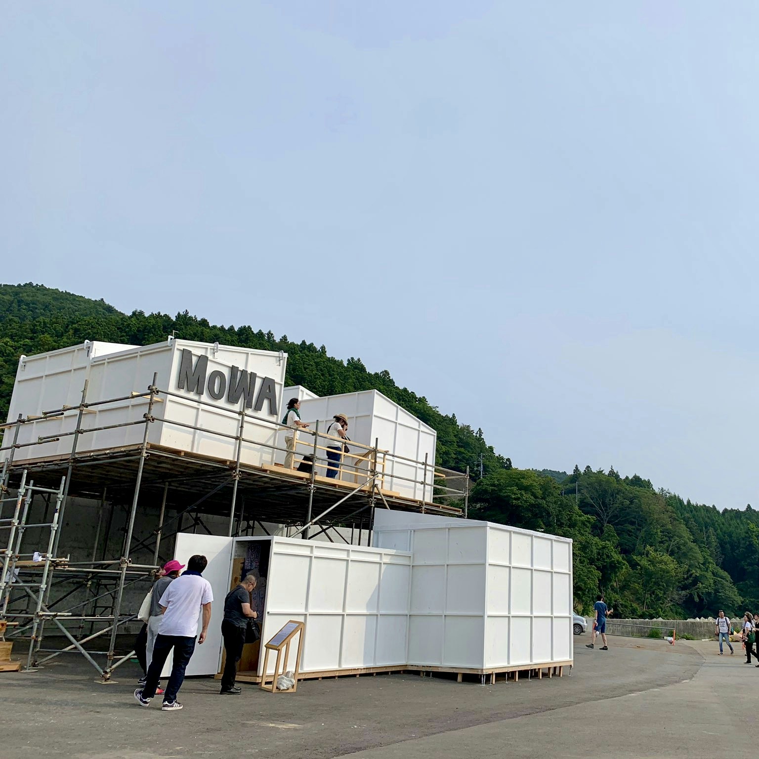 特筆すべきは、ストリート・アートを軸に活動するSIDE CORE(BIEN、EVERYDAY HOLIDAY SQUAD、リヴァ・クリストフ、森山泰地)。EVERYDAY HOLIDAY SQUADは、防潮堤に絵を描くというストリート・アートの王道ではなく、防潮堤の上に展示空間(美術館)そのものをつくってしまうという《MoWA》(2019)を発表。