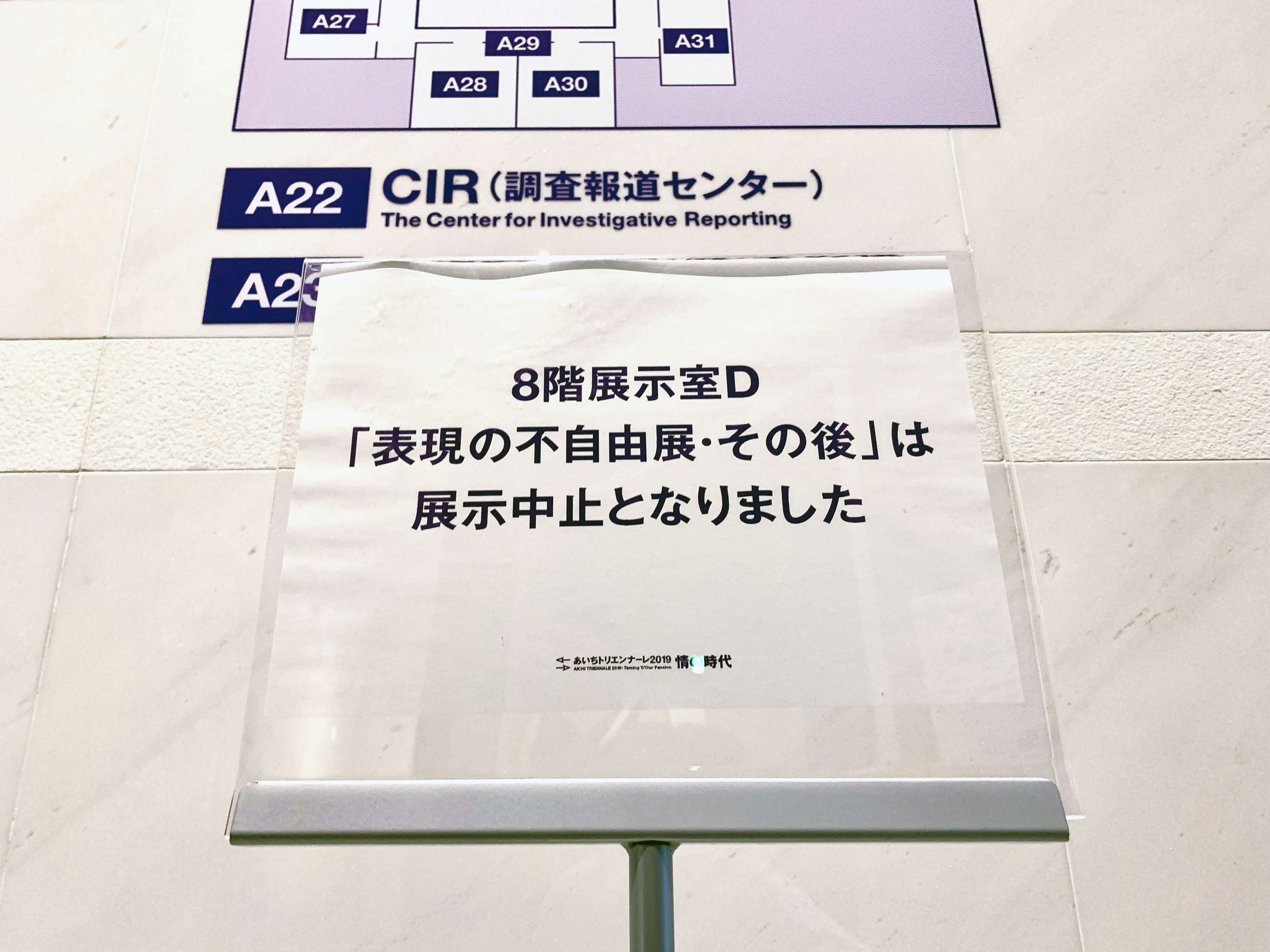 「表現の不自由展・その後」が展示中止となったことを知らせる掲示