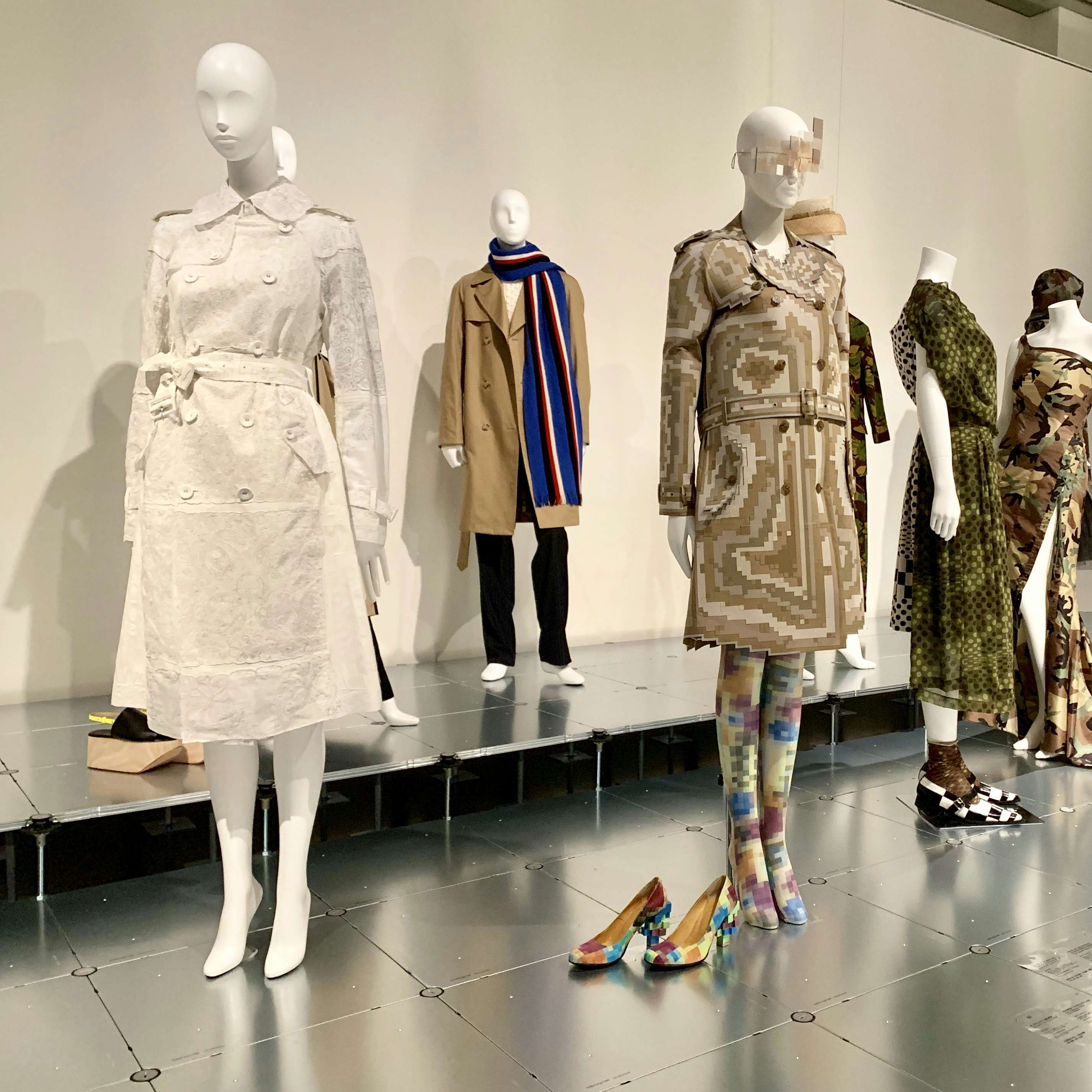 京都服飾文化研究財団キュレーターの石関亮は、本展に通底するテーマを「衣服がもとの機能から離れていくことで、様々な役割に変換されていく」ことだと話す。その最たる例は、4番目のセクション「生き残りをかけて闘わなければならない?」に並ぶミリタリー調の衣服だろう。20世紀前半の2度の戦争のなかで誕生したとされるトレンチコートと迷彩服にフォーカスしたこのセクションでは、現代的な意匠が施されたトレンチコートや迷彩柄があしらわれた着物などが登場する。