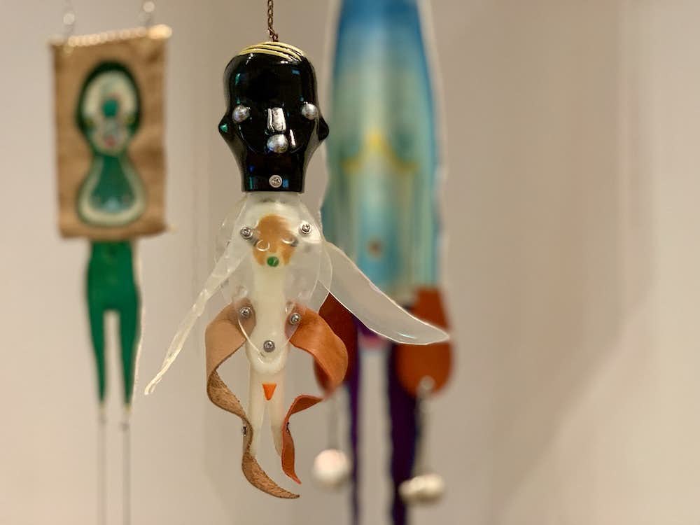無題 2019 600×207cm 布にパステル、アクリル絵具、革、刺繍、アルミ、鎖、石にリトグラフ