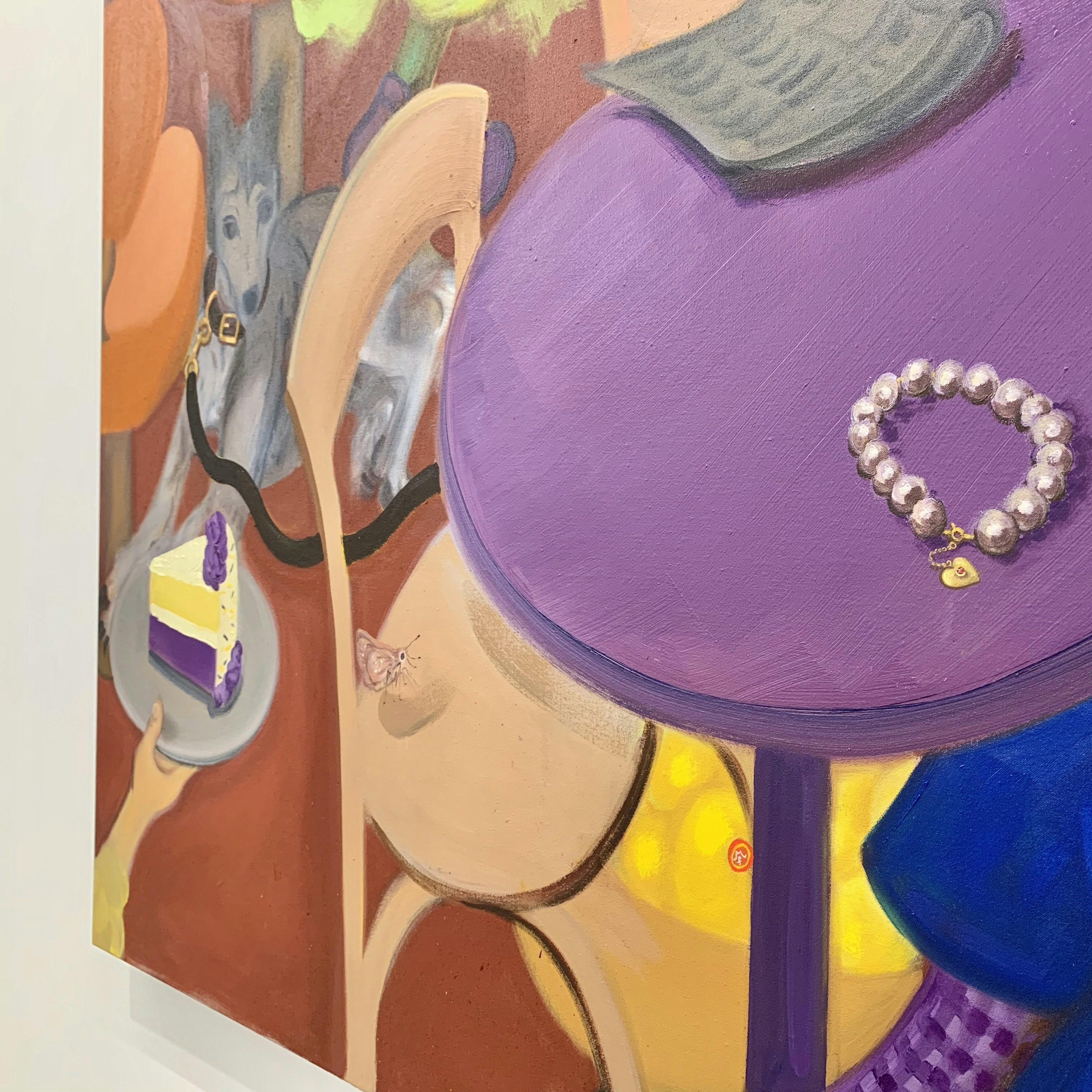 イギリス人の父とフィリピン人の母を持つファーラは、「ケーキはいろいろな国の文化的な象徴だと思います。それぞれのケーキはたんなるケーキではなく、その背後には歴史があります」と話す。出生地であるフィリピンを思わせる《ウベ・マカプノケーキ》(2019)では、フィリピンを代表するデザートとも言える紫色のウベ・マカプノケーキや、バナナ柄のワンピースを着ている女性、熱帯地方で栽培されるマンゴーなどが描かれている。「フィリピンの夏の夜は本当に暑くて、濃い紫はフィリピンの夜のようなものだと思っています」。