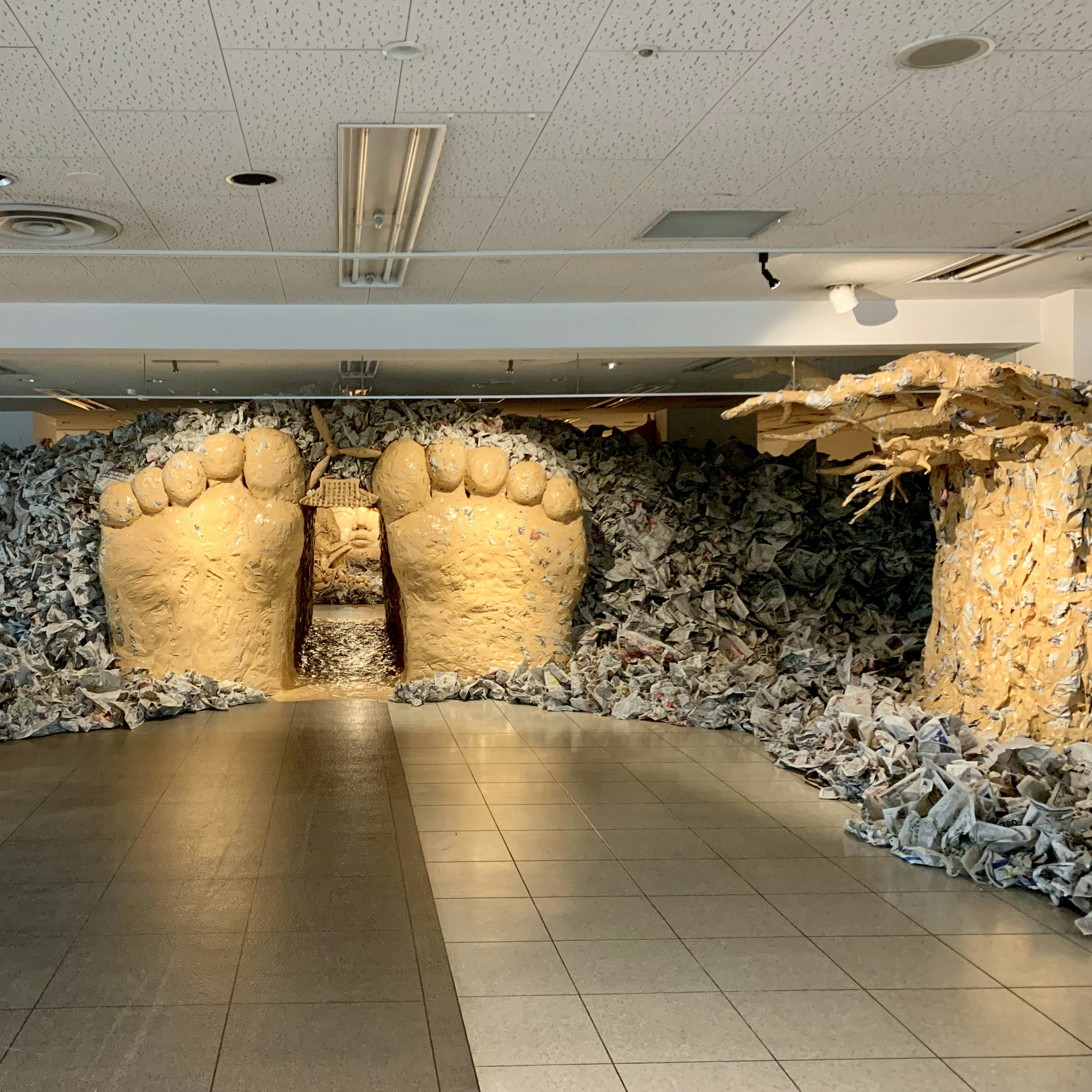 発表の舞台となるのは約30年にわたって地元で親しまれて来た百貨店「トキハ別府店」。百貨店の4階から5階へとエスカレーターを上った先のフロアで来場者を迎える2つの大きな足の隙間をくぐった先に現れるのは、特別な「世界地図」だ。