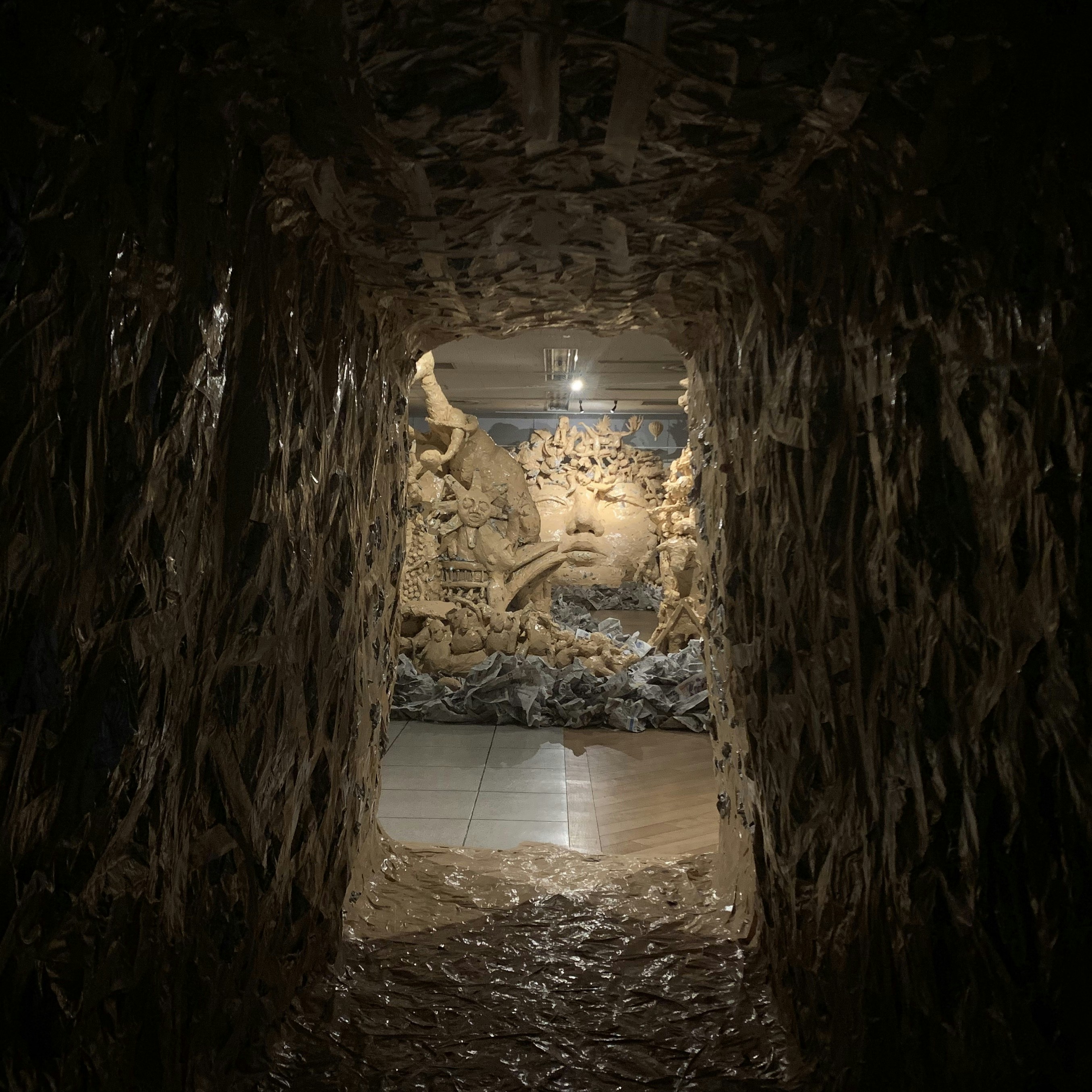 関口が集中的に取り組んだという入口のトンネルをかたちづくる2つの足、そして顔など、本展には薬師如来を表す要素が点在する。会場全体が世界地図であり、薬師如来であるという構図だ。