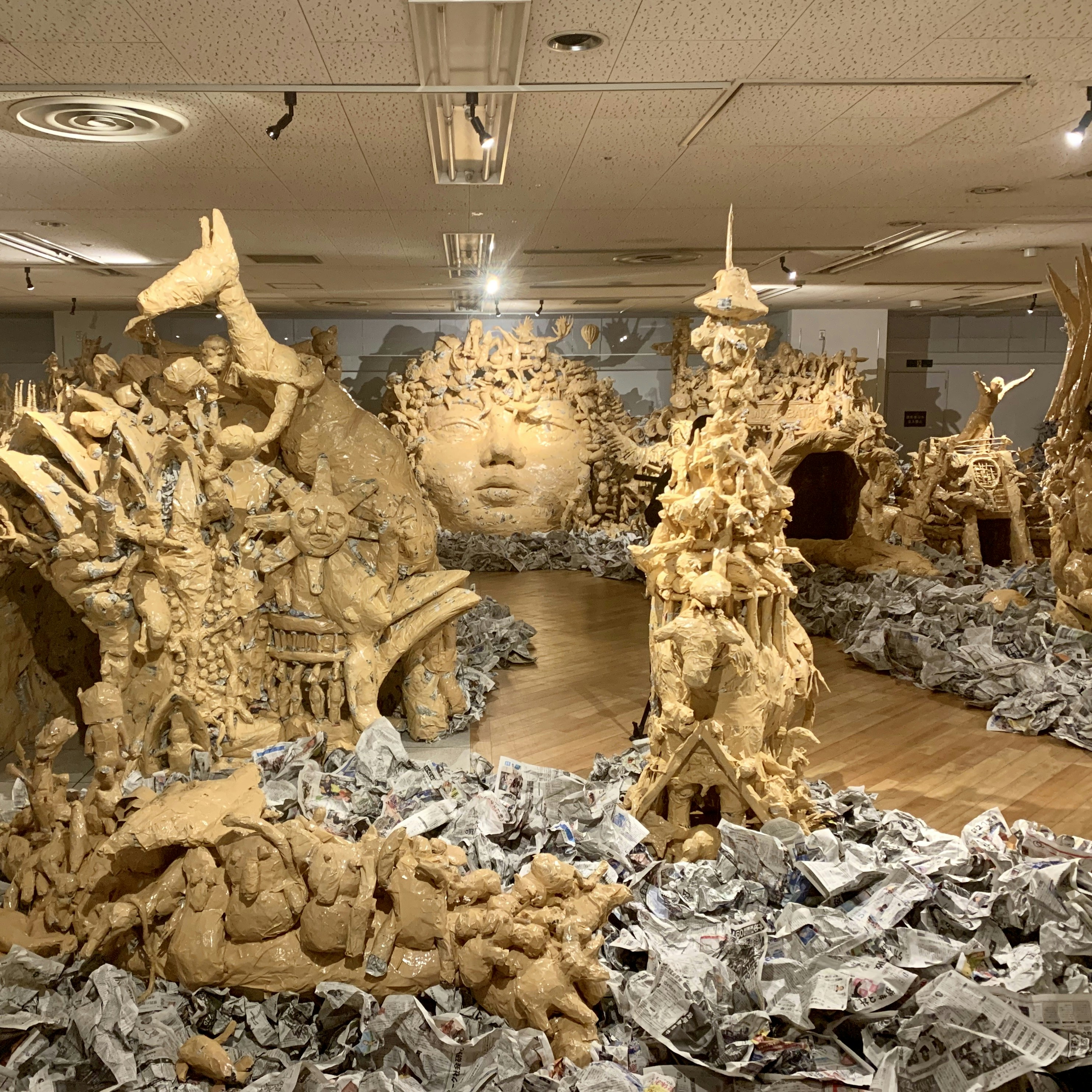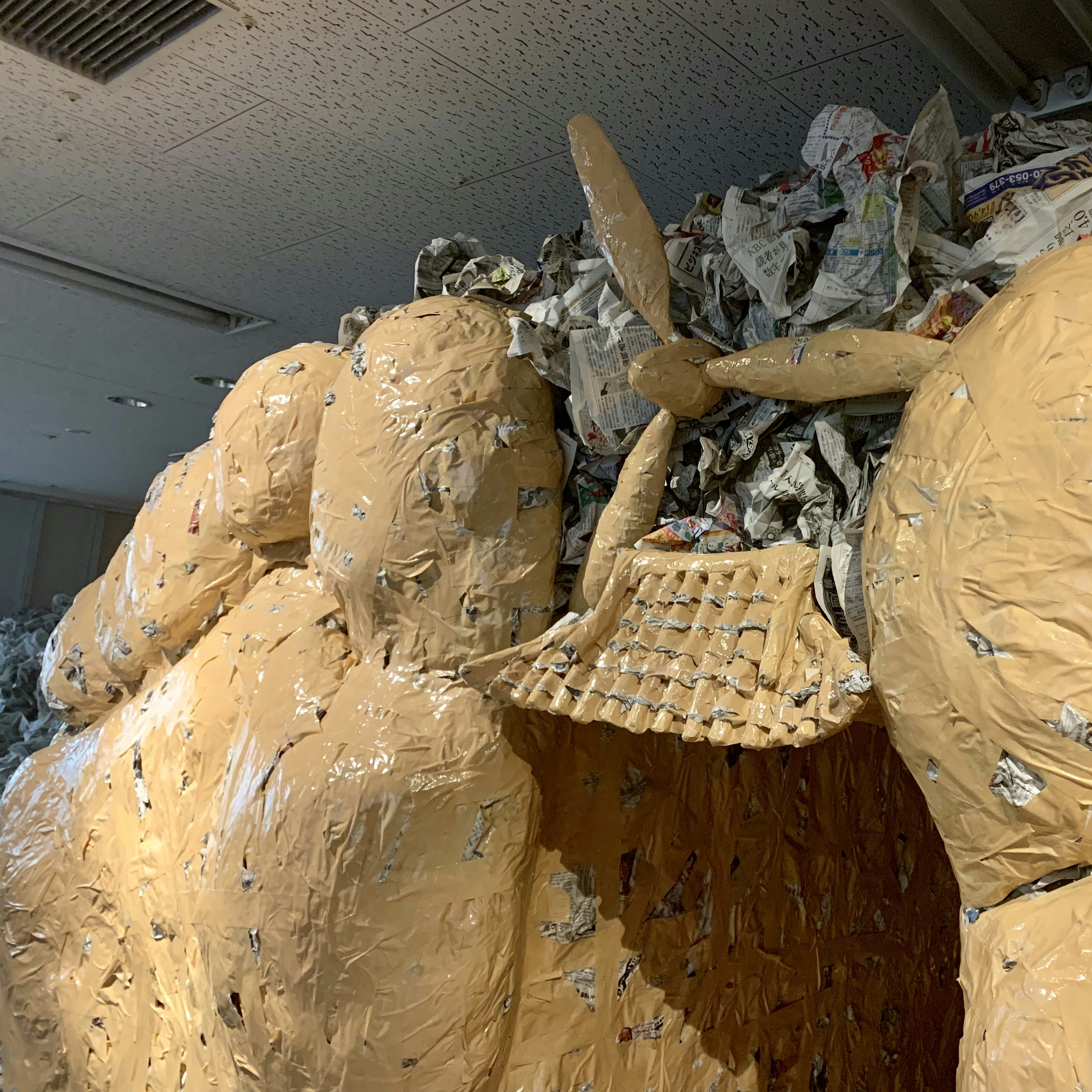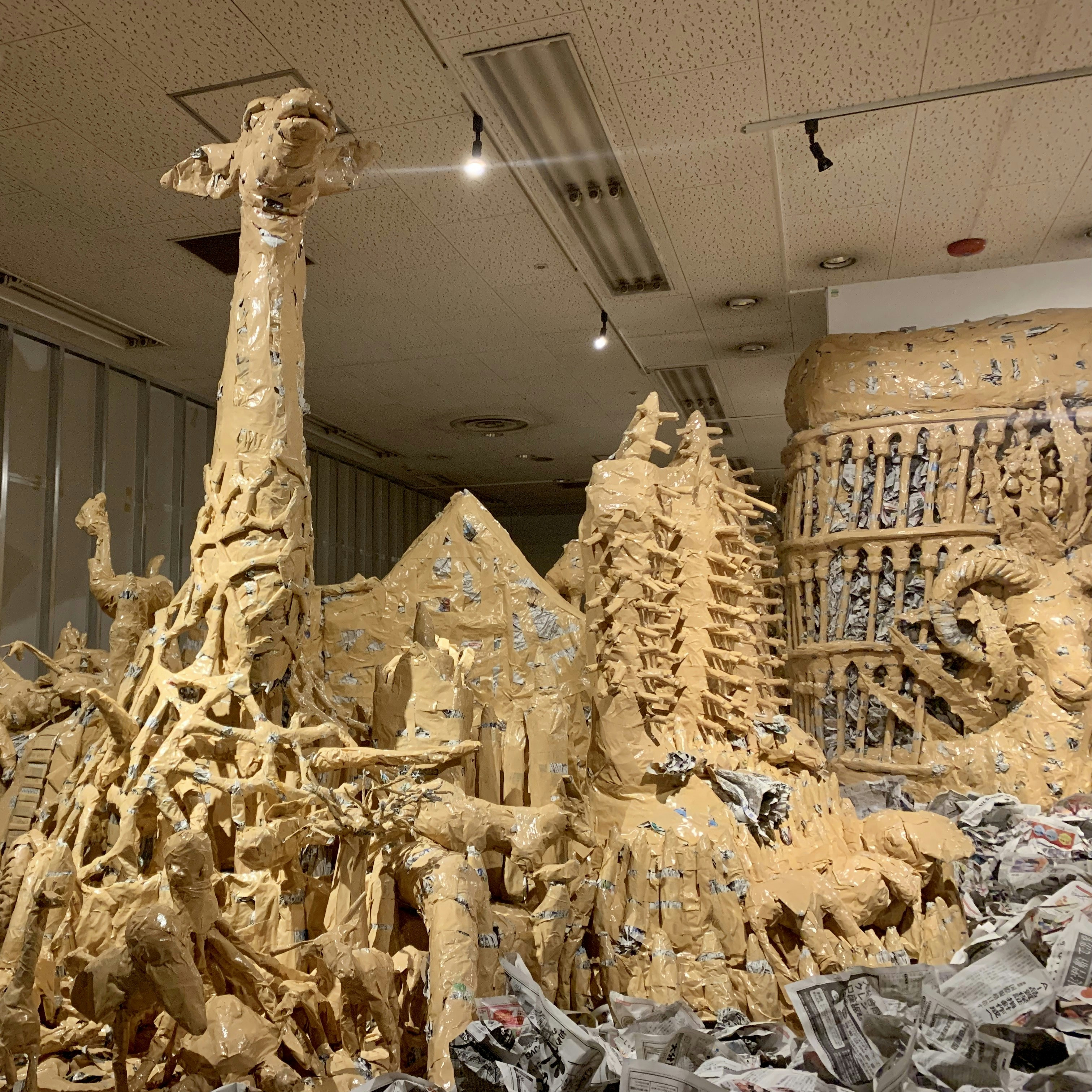 全体を見ると、空間を活用したダイナミックなインスタレーション作品として、細部を見れば、モチーフへの推測を促す個性豊かな彫刻作品のように見えてくる本作。会場を出れば、そこにはガムテープと新聞紙が置かれた小さなワークショップスペースもある。「まだまだ空間には余地があるので、そこにみなさんが制作した作品を加えていきたいです」と関口が話す本作は、会期中に成長し続ける世界地図とも言えるだろう。