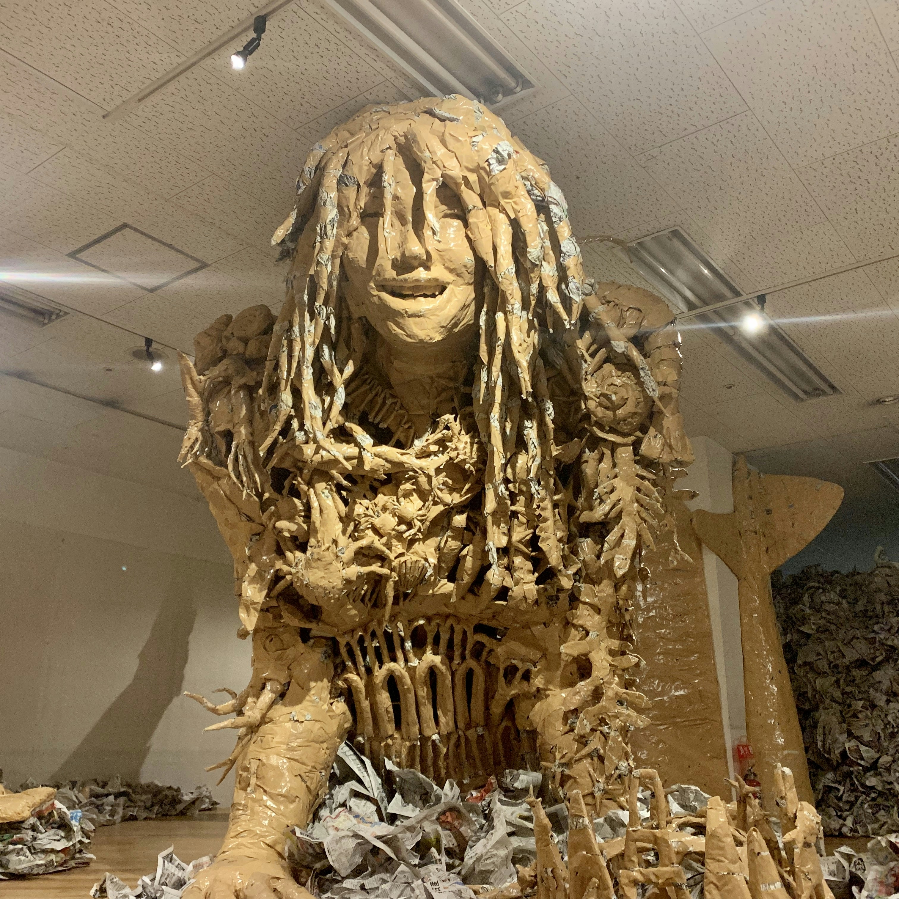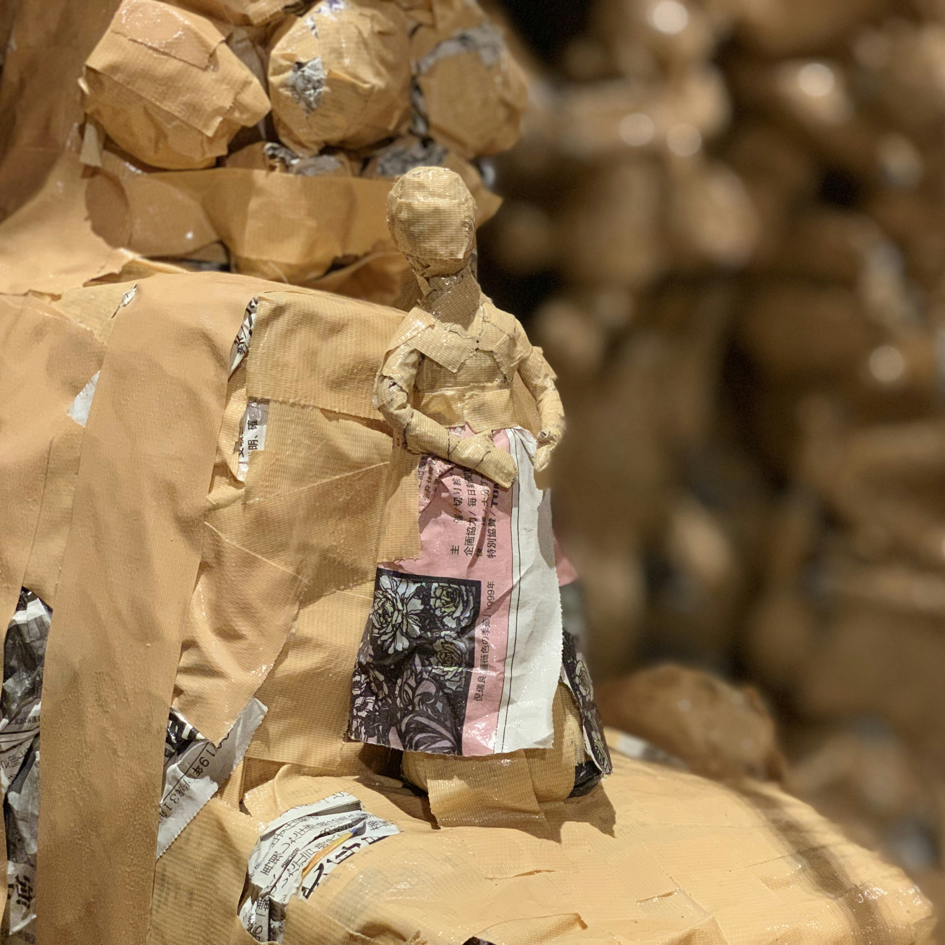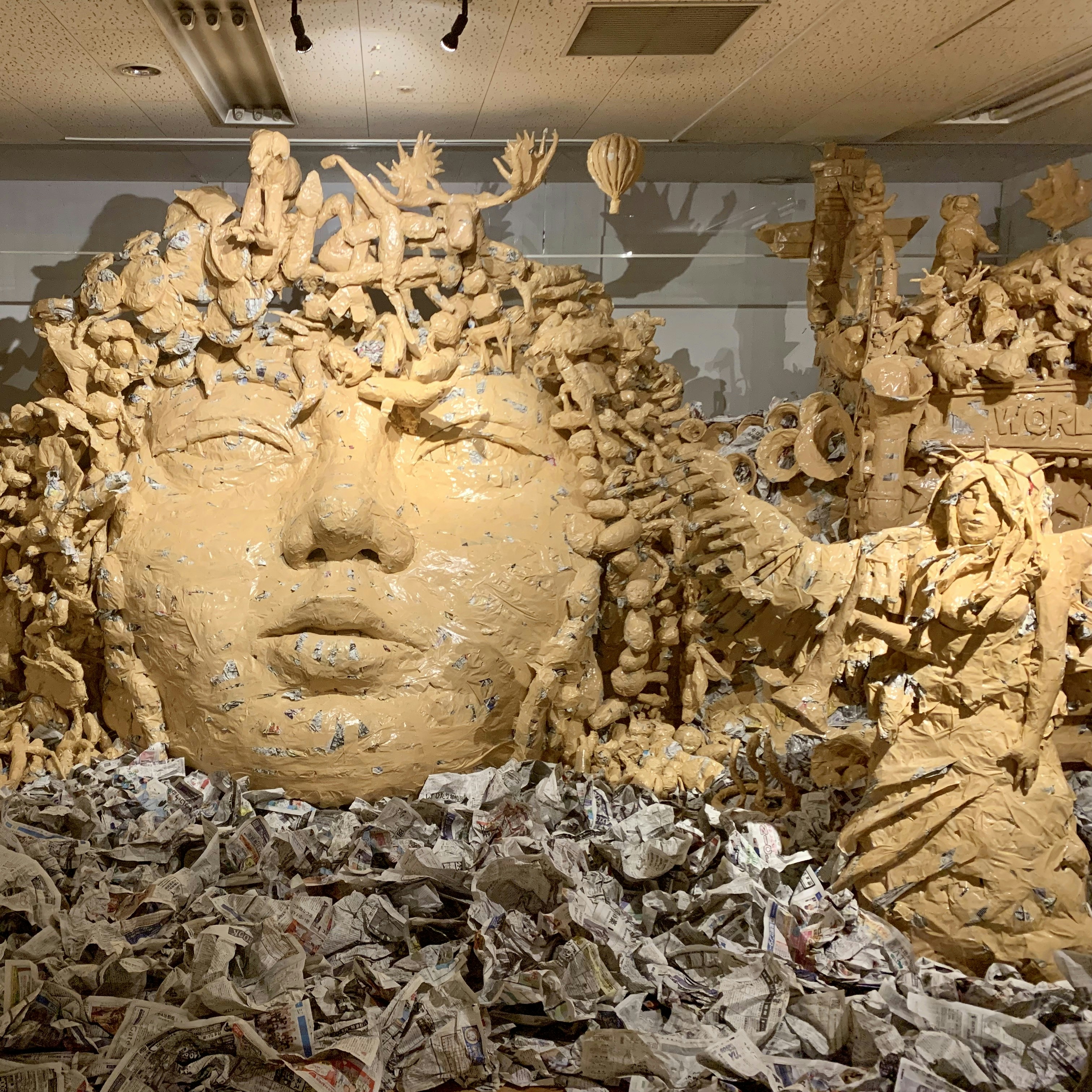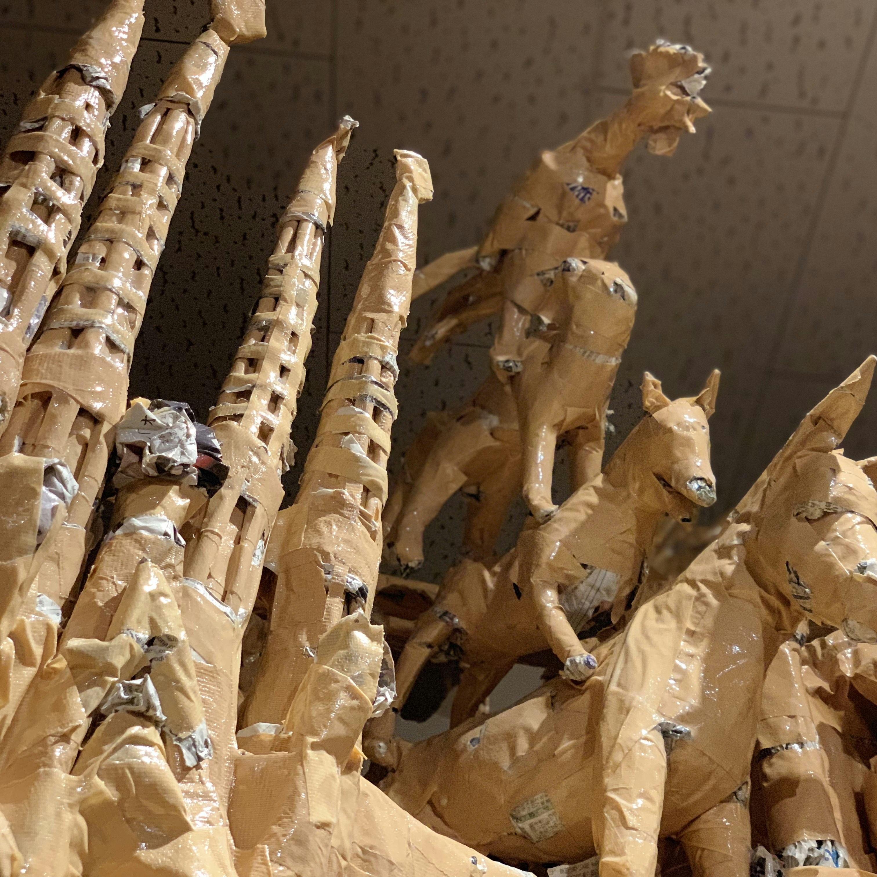 全体を見ると、空間を活用したダイナミックなインスタレーション作品として、細部を見れば、モチーフへの推測を促す個性豊かな彫刻作品のように見えてくる本作。会場を出れば、そこにはガムテープと新聞紙が置かれた小さなワークショップスペースもある。「まだまだ空間には余地があるので、そこにみなさんが制作した作品を加えていきたいです」と関口が話す本作は、会期中に成長し続ける世界地図とも言えるだろう。