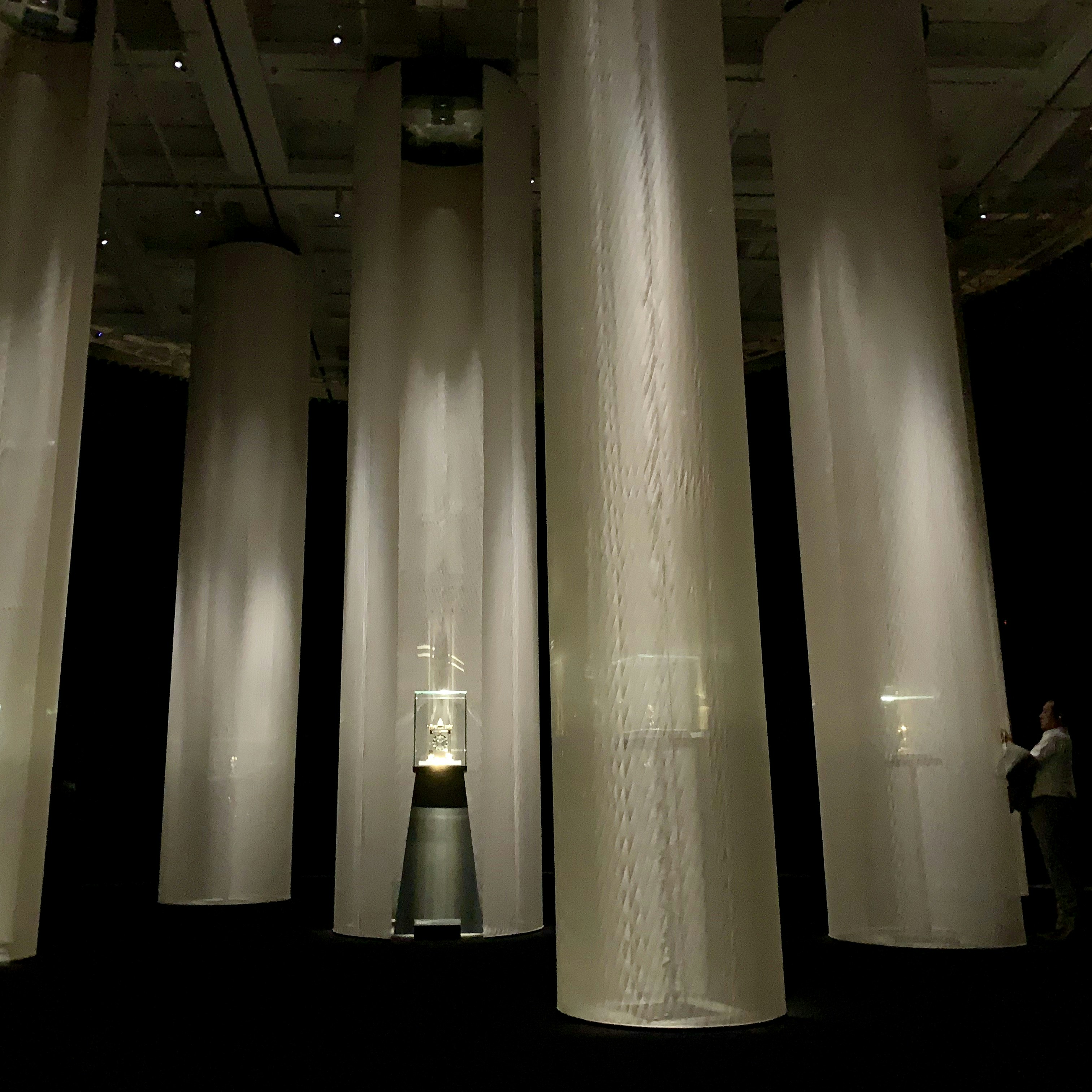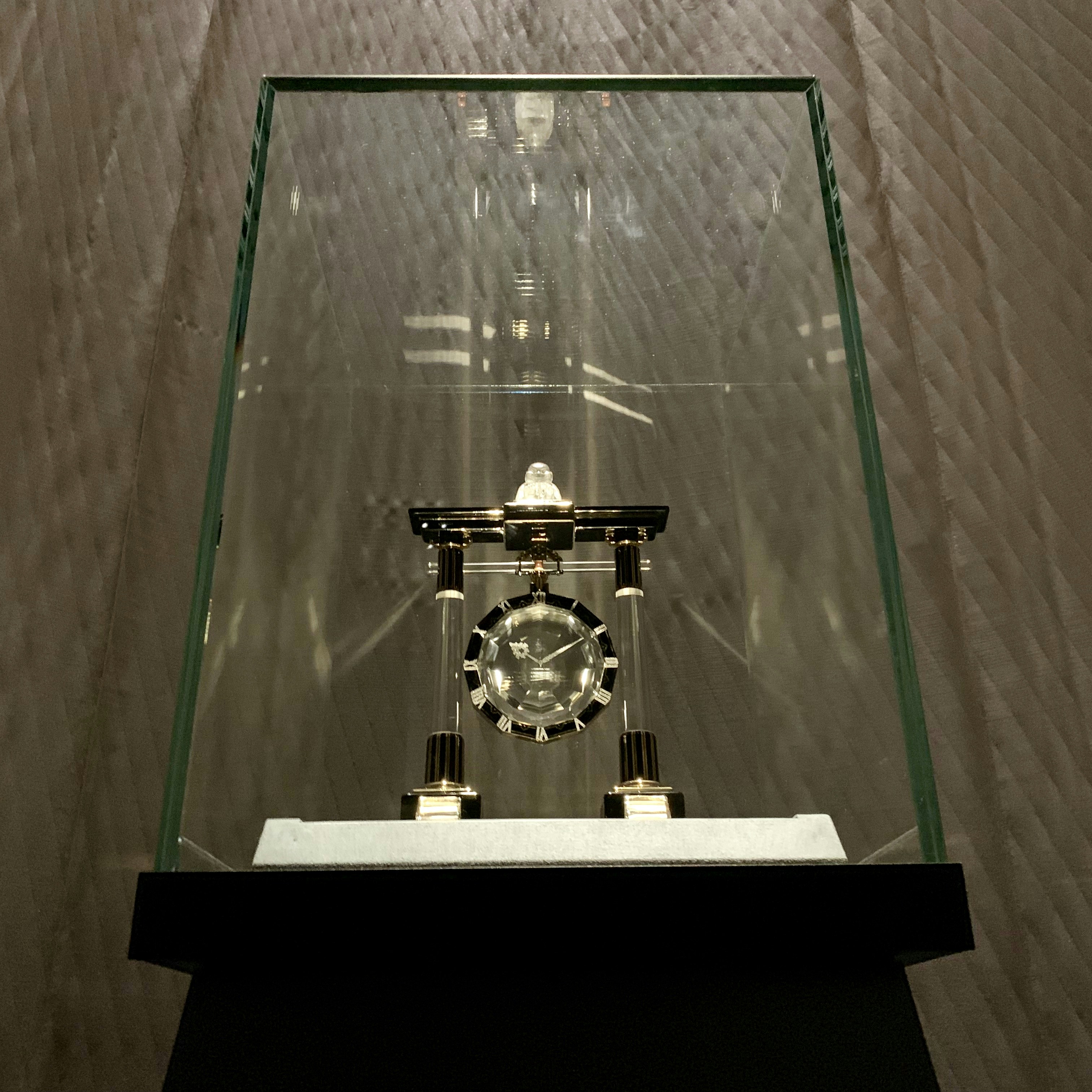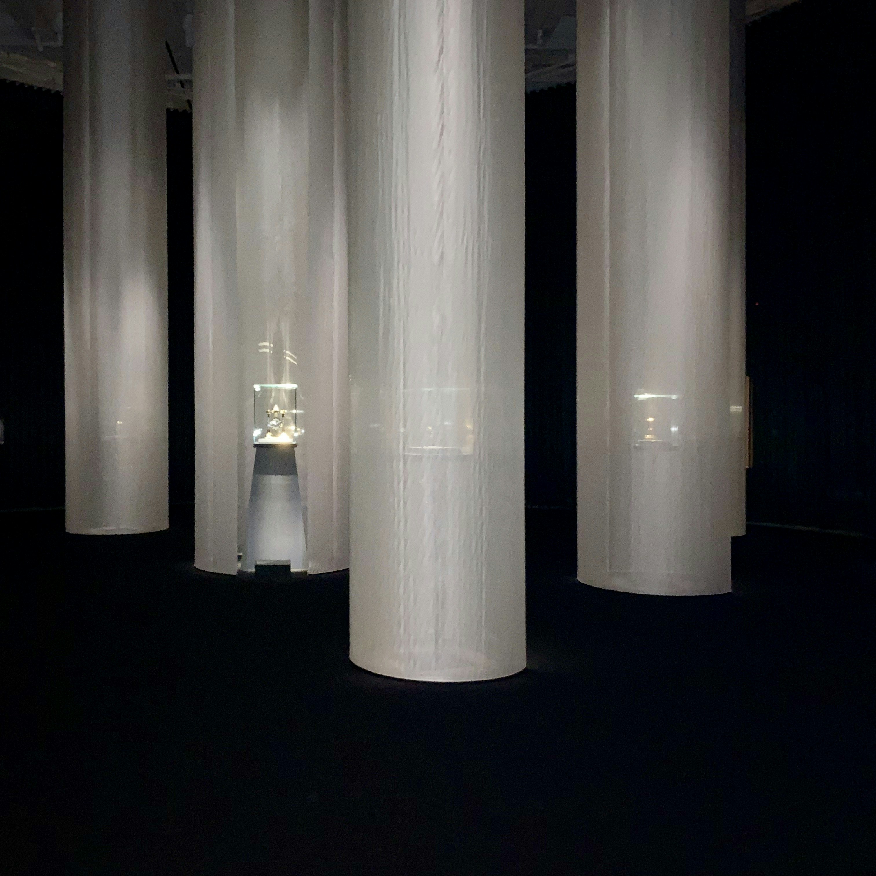 「時の間 ミステリークロック、プリズムクロック」と題された序章では、展示スペースが円形に構成され、カルティエが手がけた時計の数々が並ぶ。それぞれが縦に伸びた12本の白いベールの中にひっそりと展示されており、それらは光の柱のようにも見える。「時」をテーマにした本展を象徴するような場所だ。