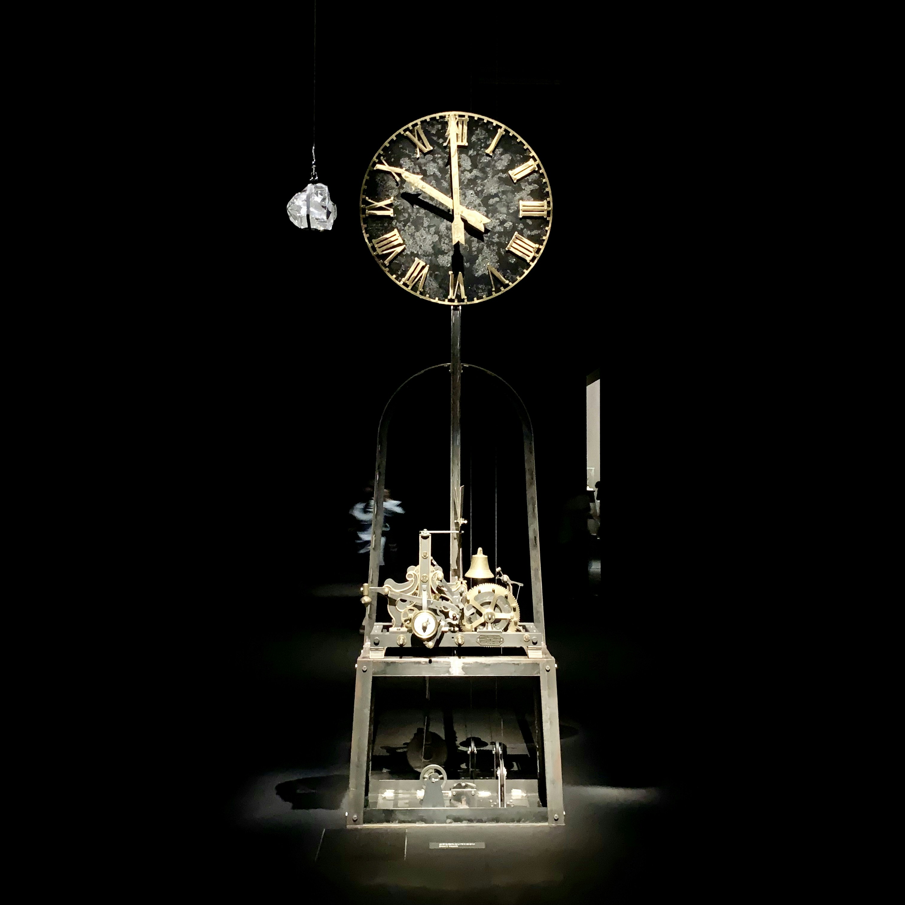 会場はまず、杉本博司が手がけた巨大な時計《逆光時計》(2018)からスタート。本作は、100年以上昔の時計を素材としたもので、その名の通り逆進する時計を起点に、「物質の世界」へと入っていく。