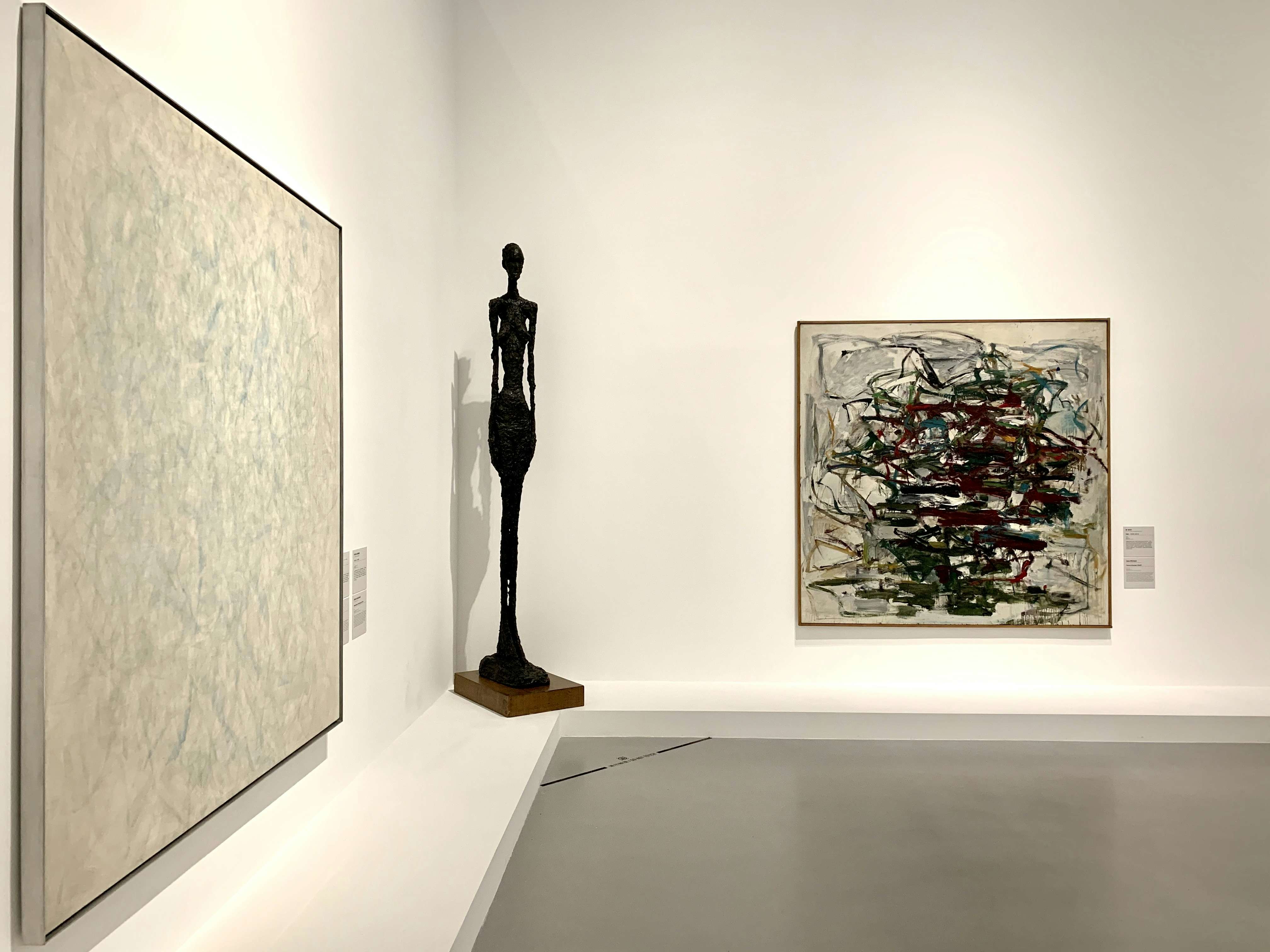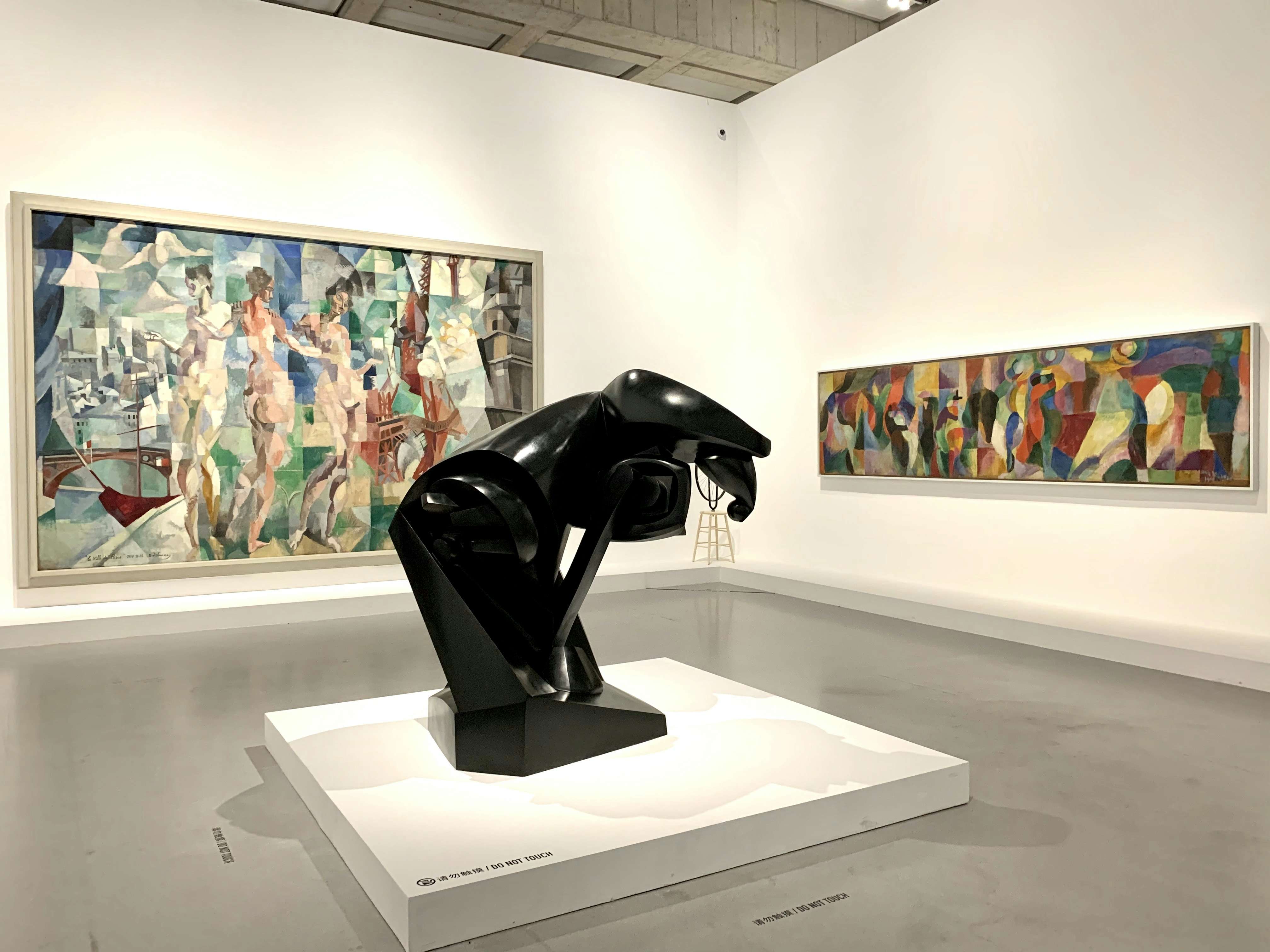 壁に見えるこちらはダニエル・ビュレンの《Never Twice the Same, work in situ》(1968-85/2019)
