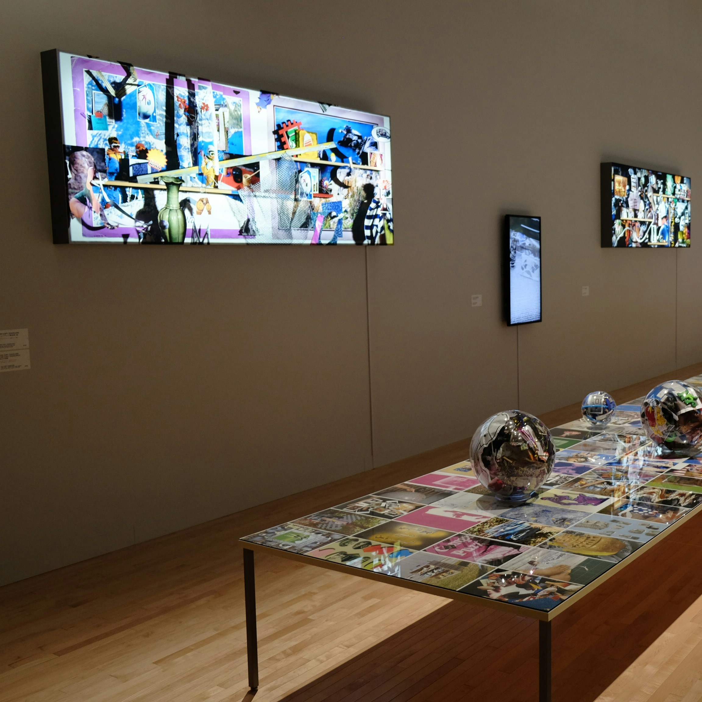本展では、3人がコピー機でコラージュをつくり続ける様子を映した映像作品や、ガラスのテーブル上に作品を並べたインスタレーションなど、THE COPY TRAVELERSの活動を端的に伝える作品が目をひく。また、タイ・バンコクの旅で3人が出会った大量のイメージからつくられたというライトボックスの作品では、図像の意味をコピーと切り貼りによって引き剥がすという実践が試みられている。