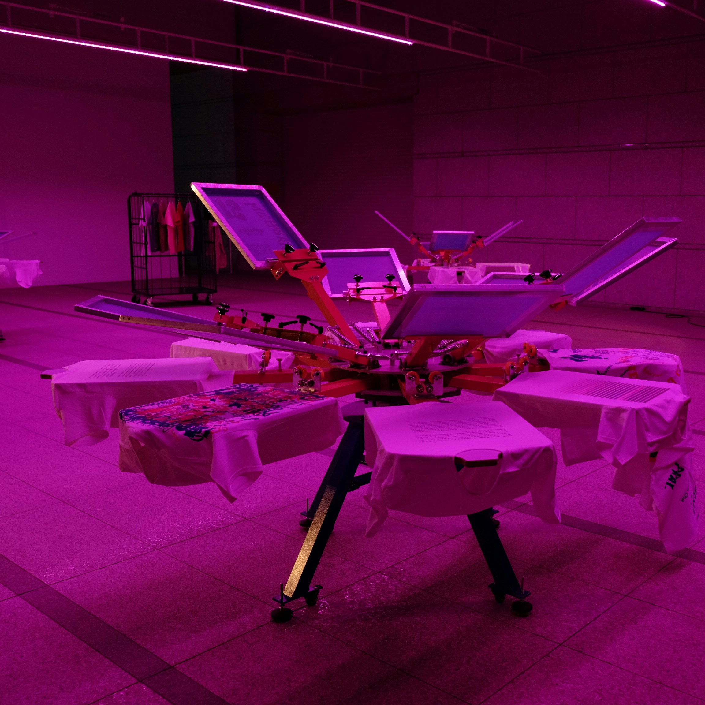 本展では、Tシャツにプリントするシルクスクリーンの機械を、紫色のライトで照らしたインスタレーションを展示。敗戦後、アメリカの影響から日本人がTシャツを着ることで始まったストリートファッションの歴史に注目した本作は、原宿や代々木といった米軍が駐留していた場所を生きた人々の物語が、プリントというかたちでTシャツと一体になる。