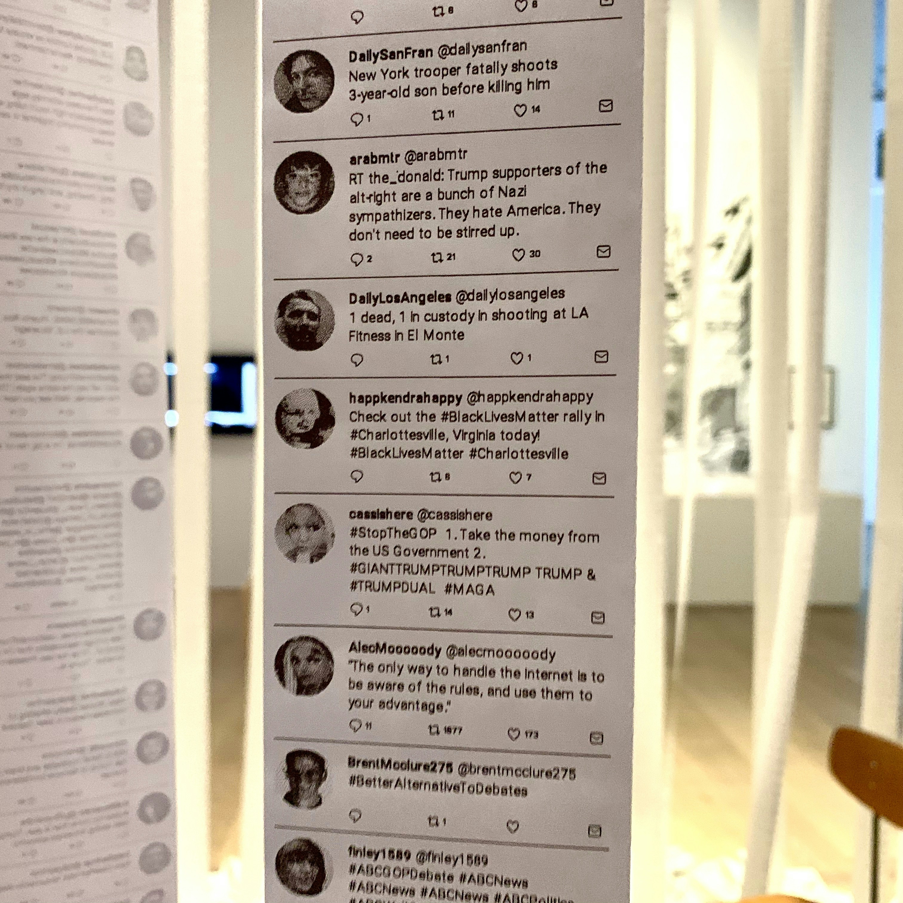 架空の人物たちの肖像とTweetを組み合わせた、マイク・タイカ《私たちと彼ら》(2018)は、SNSというバーチャルな空間を現実空間に呼び出すことで、その危うさを提示する。