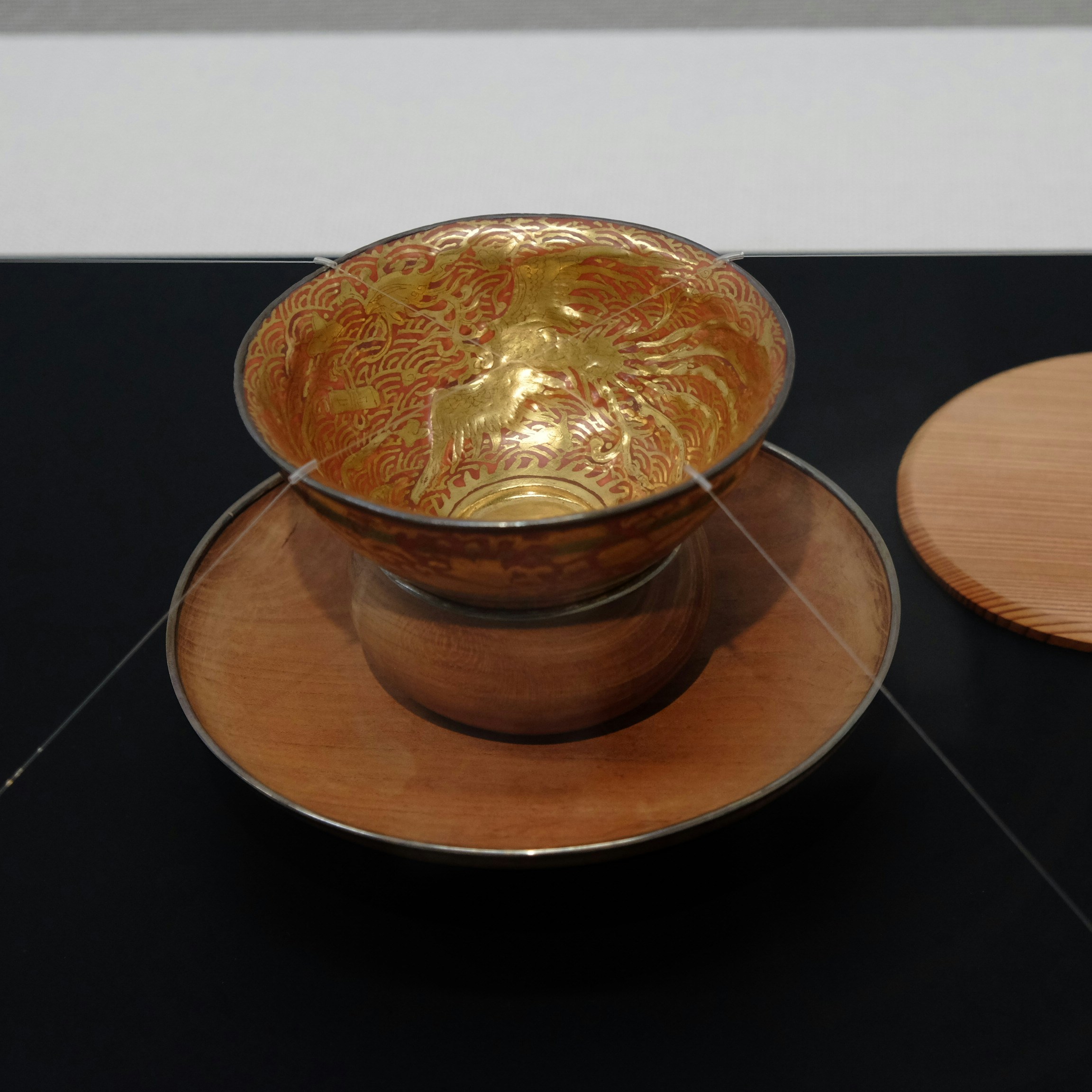 献茶の際に、実際に明治天皇が喫茶した茶碗が、永樂和全《赤地金襴手法王天目》(19世紀)だ。胴に花唐草文、見込には鳳凰の浮文を施したうえに、赤地金彩と鳳凰、青海波・宝尽文を描いた茶碗で、この献茶のために和全に焼かせたものだという。他にも朝鮮半島で日本向けに焼かれたとされる《御所丸茶碗》(17世紀)や、樂長次郎《黒楽茶碗 銘メントリ》(16世紀)など、献茶の当日、天皇に供奉した歴々が使った名碗も展示されている。